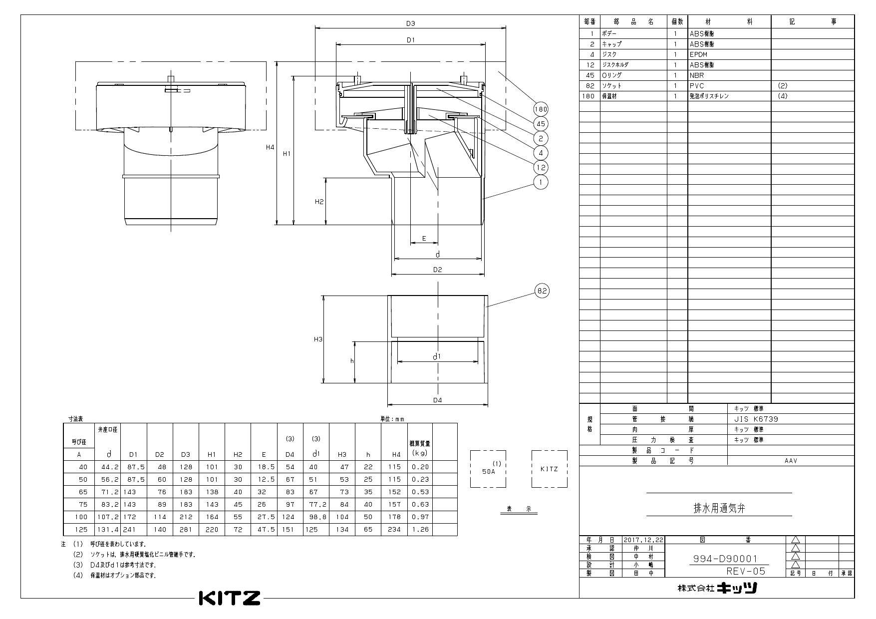 ●弁種: 排水用通気弁 ●接続形状: JIS K6739 ●ボデー: ABS樹脂 ●キャップ: ABS樹脂 ●ジスク: EPDM ●ジスクホルダ: ABS樹脂 ●Oリング: NBR