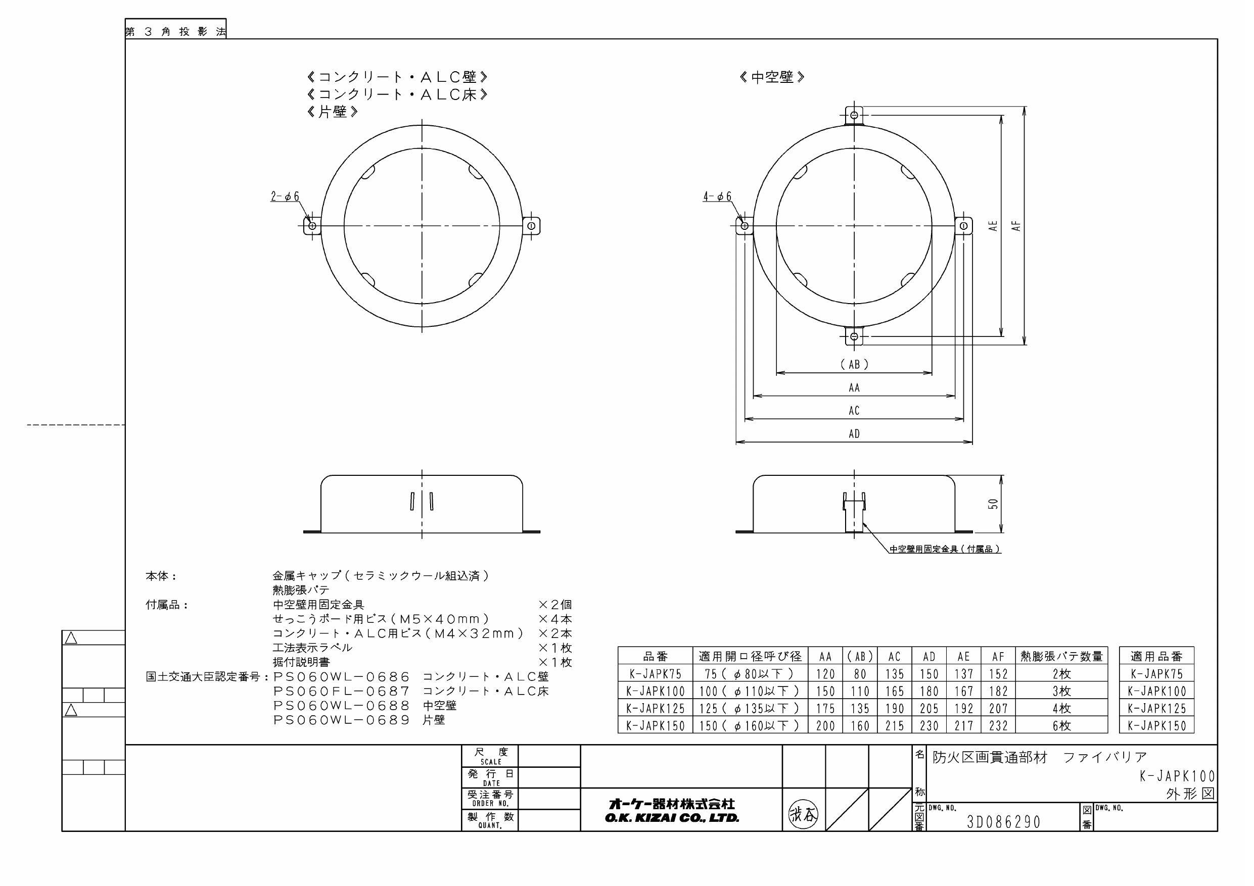 適合開口呼び径100(φ110以下)内容:・金属キャップ×1・熱膨張パテ×3・中空壁固定用金具×2・石膏ボード用ビス(M5x40mm)×4・コンクリート・ACL用ビス(M4x32mm)×2・工法表示ラベル×1 据付説明書