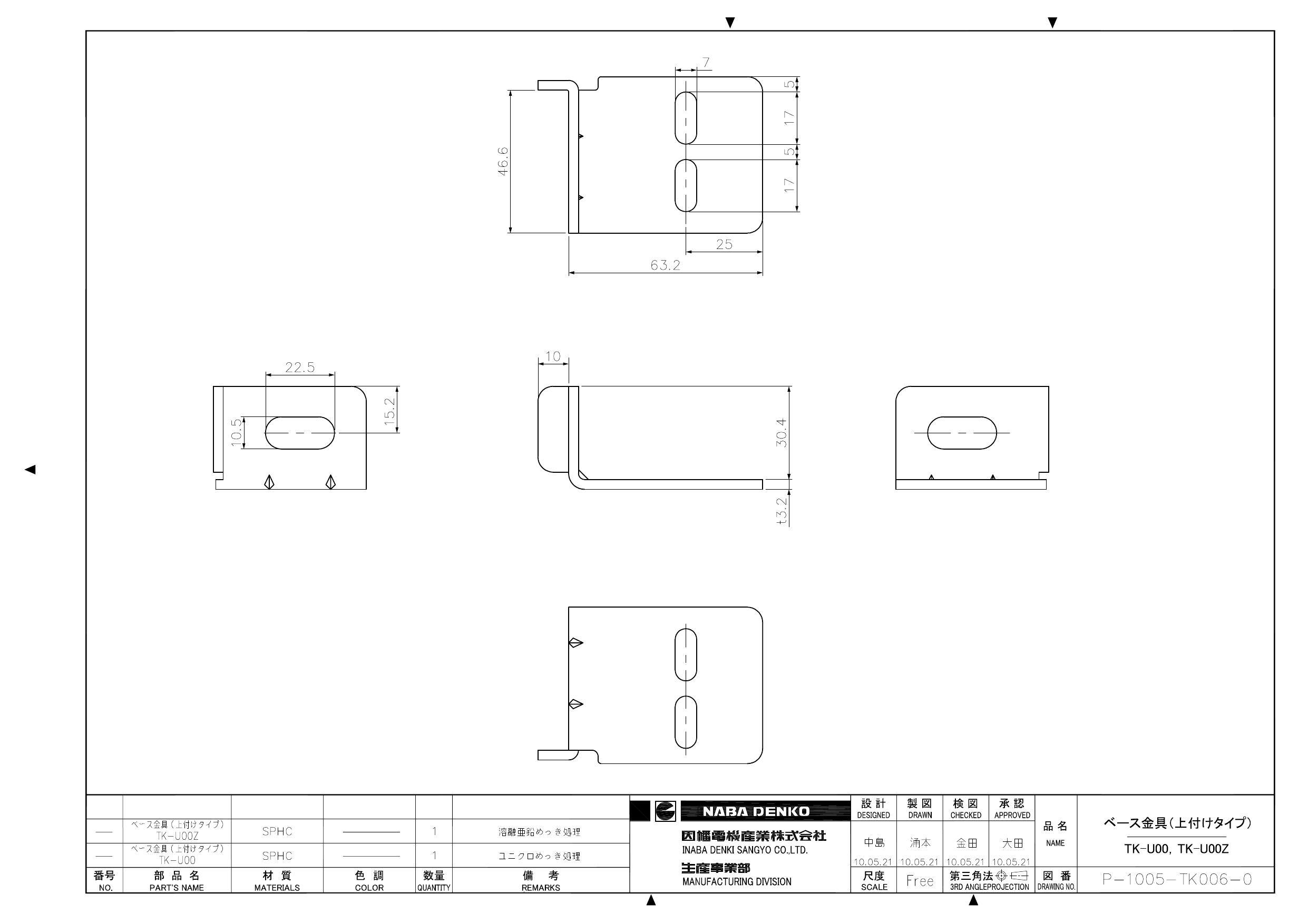 屋内仕様材質…SPHC(ユニクロめっき処理) 屋外仕様(ドブ漬け)材質…SPHC(溶融亜鉛めっき HDZ35相当)