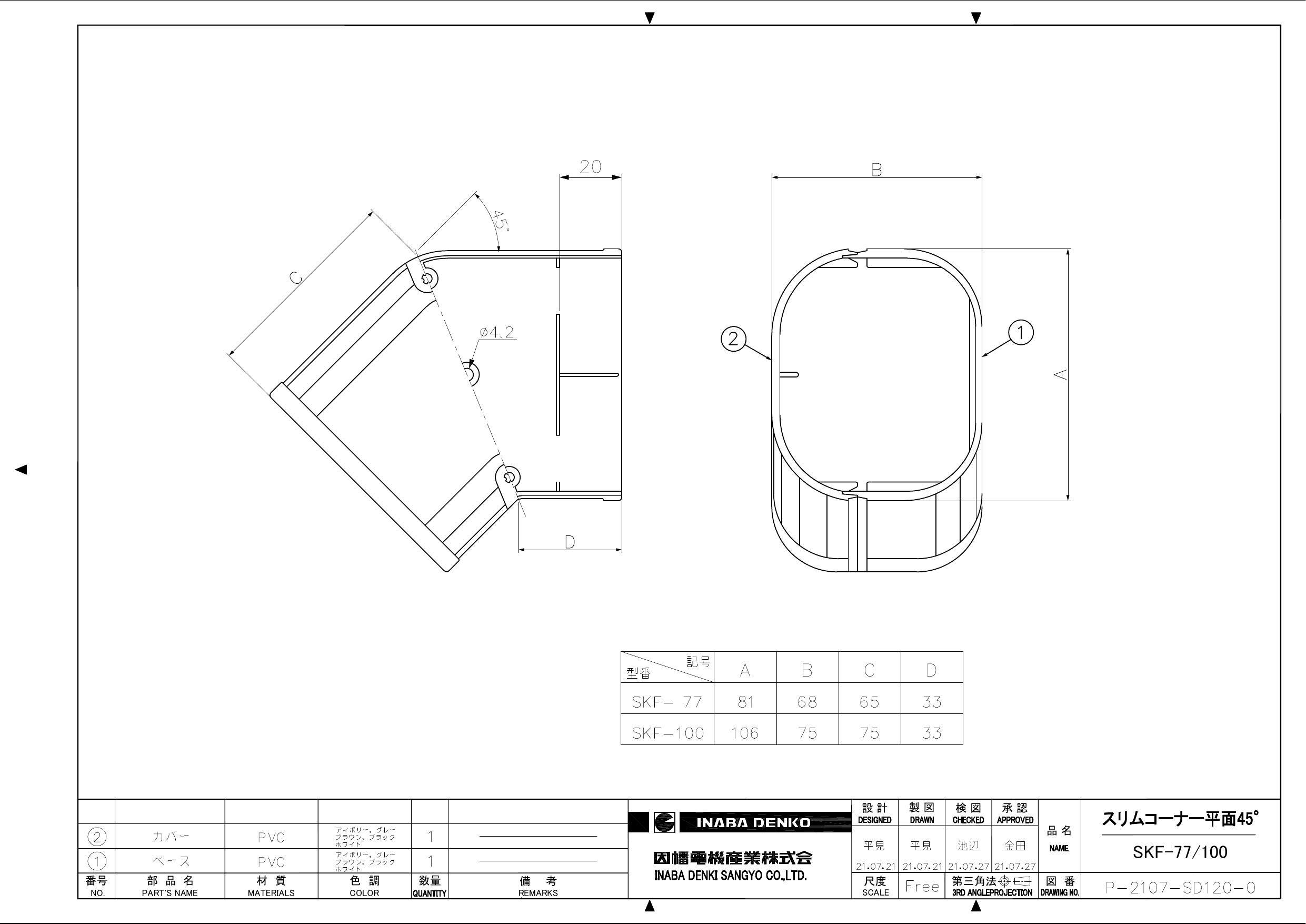 因幡電機産業 SKF-100-I スリムコーナー 平面45° アイボリー 00000428679【別送品】