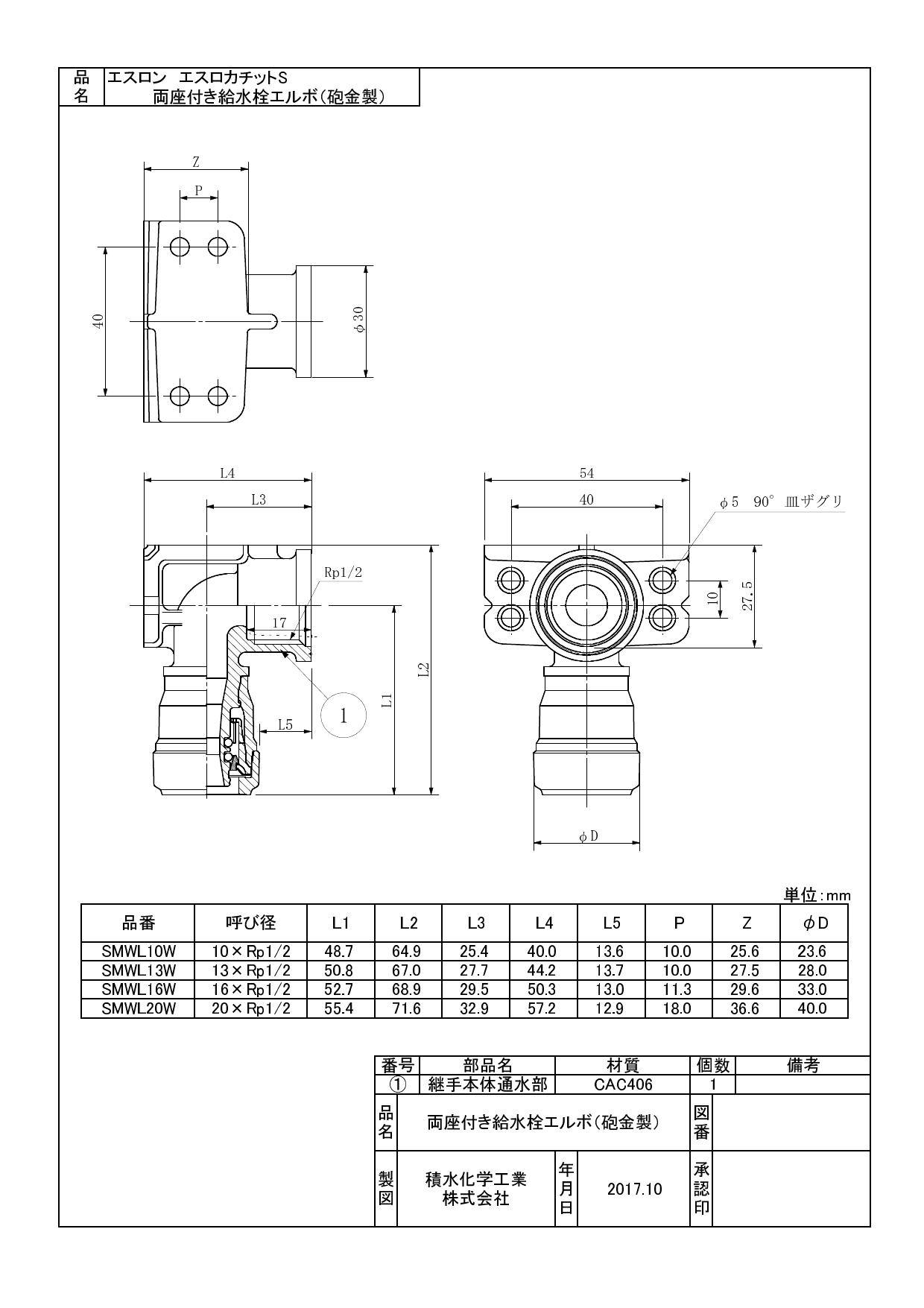 セキスイ 積水化学工業 SMWL-W 16XRP1/2 SMWL-W エスロカチットS 両座付き給水栓エルボ 砲金製 16XRP1/2 配管部材 エスロカチットS 00000810175【別送品】