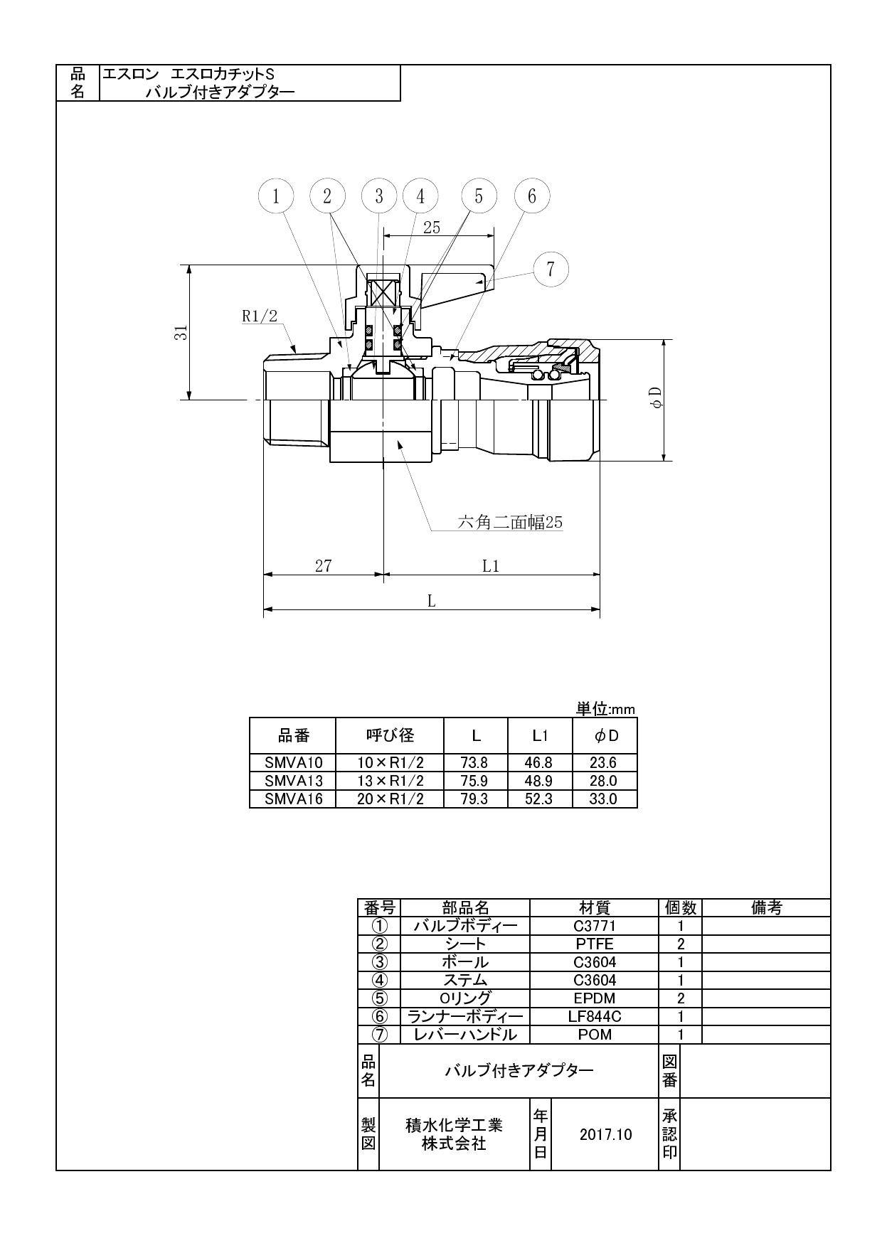セキスイ 積水化学工業 SMVA 13XR1/2 SMVA エスロカチットS バルブ付きアダプター 13XR1/2 配管部材 エスロカチットS 00000810199【別送品】