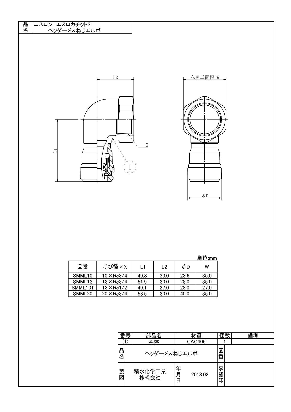 セキスイ 積水化学工業 SMML 13XRC1/2 SMML エスロカチットS ヘッダーメスねじエルボ 13XRC1/2 配管部材 エスロカチットS 00000813868【別送品】