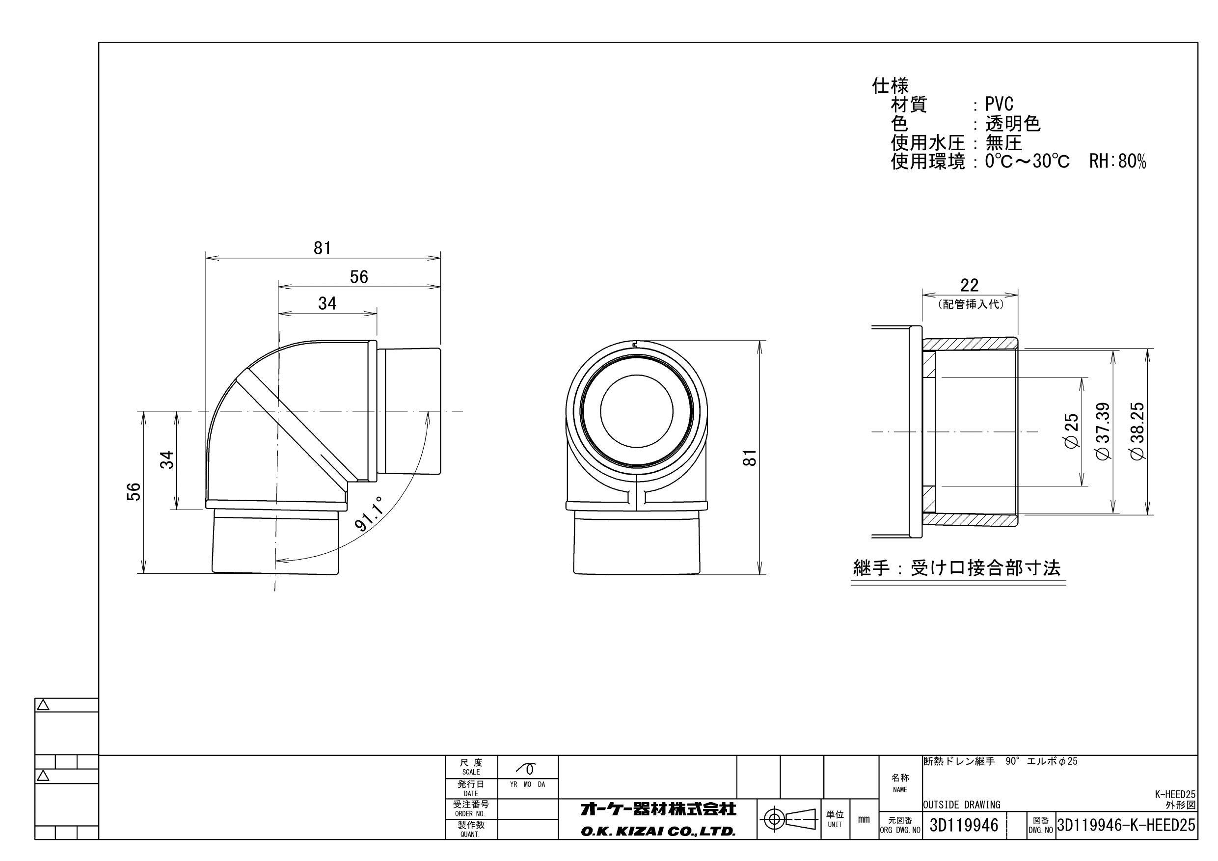 オーケー器材 K-HEED 25 K-HEED 断熱ドレン継手 90°エルボ 25 空調部材 断熱ドレン 結露防止層付 00000849459【別送品】