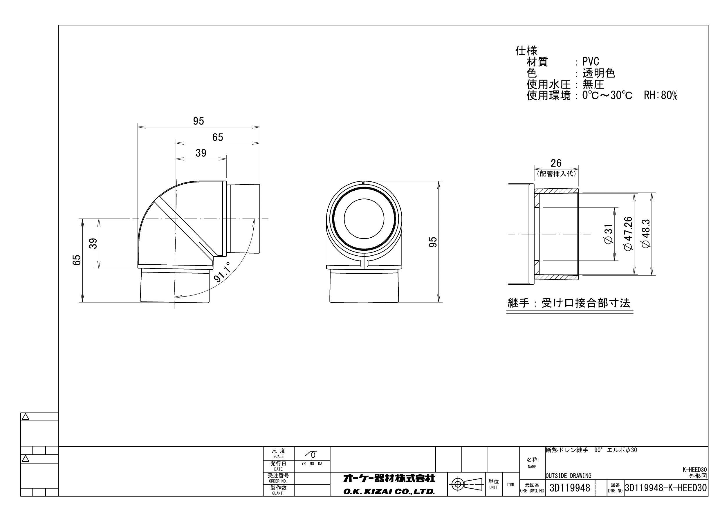 オーケー器材 K-HEED 30 K-HEED 断熱ドレン継手 90°エルボ 30 空調部材 断熱ドレン 結露防止層付 00000849460【別送品】