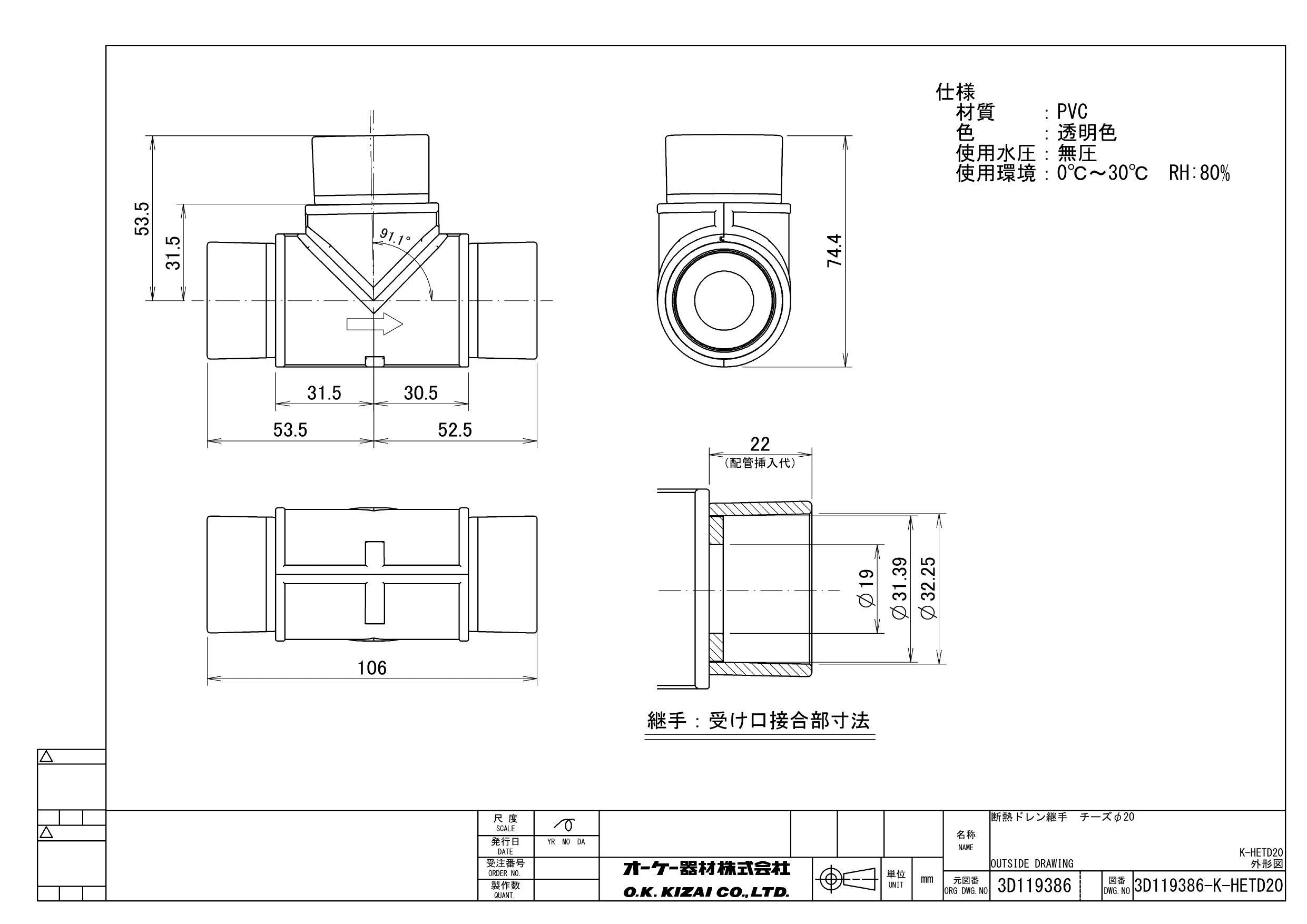 オーケー器材 K-HETD 20 K-HETD 断熱ドレン継手 チーズ 20 空調部材 断熱ドレン 結露防止層付 00000849468【別送品】