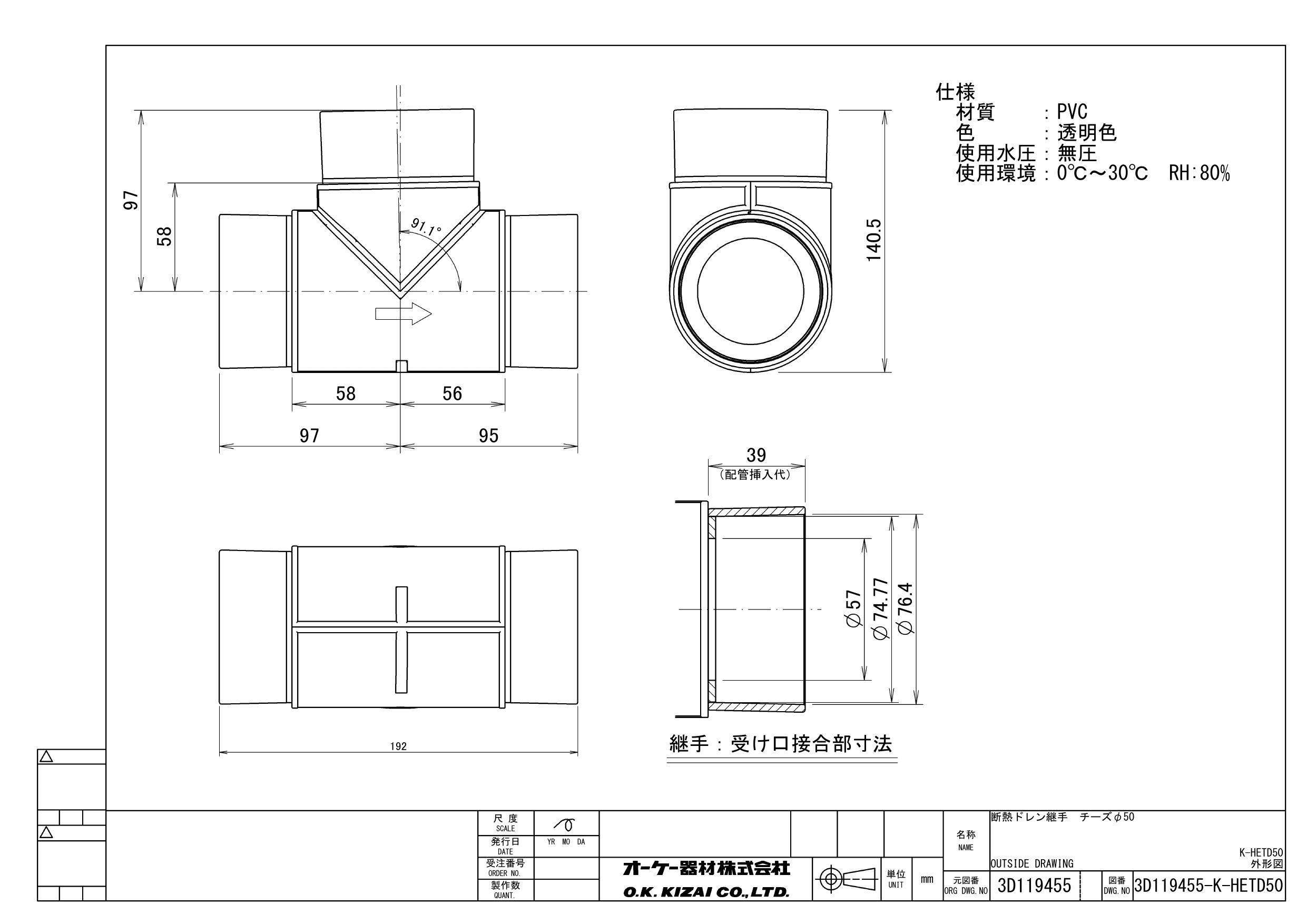 オーケー器材 K-HETD 50 K-HETD 断熱ドレン継手 チーズ 50 空調部材 断熱ドレン 結露防止層付 00000849472【別送品】
