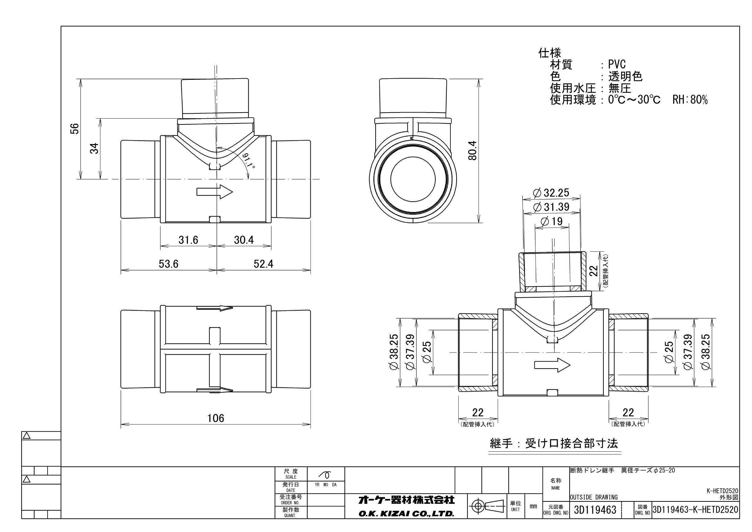 オーケー器材 K-HETD 25X20 K-HETD 断熱ドレン継手 チーズ 25X20 空調部材 断熱ドレン 結露防止層付 00000849473【別送品】
