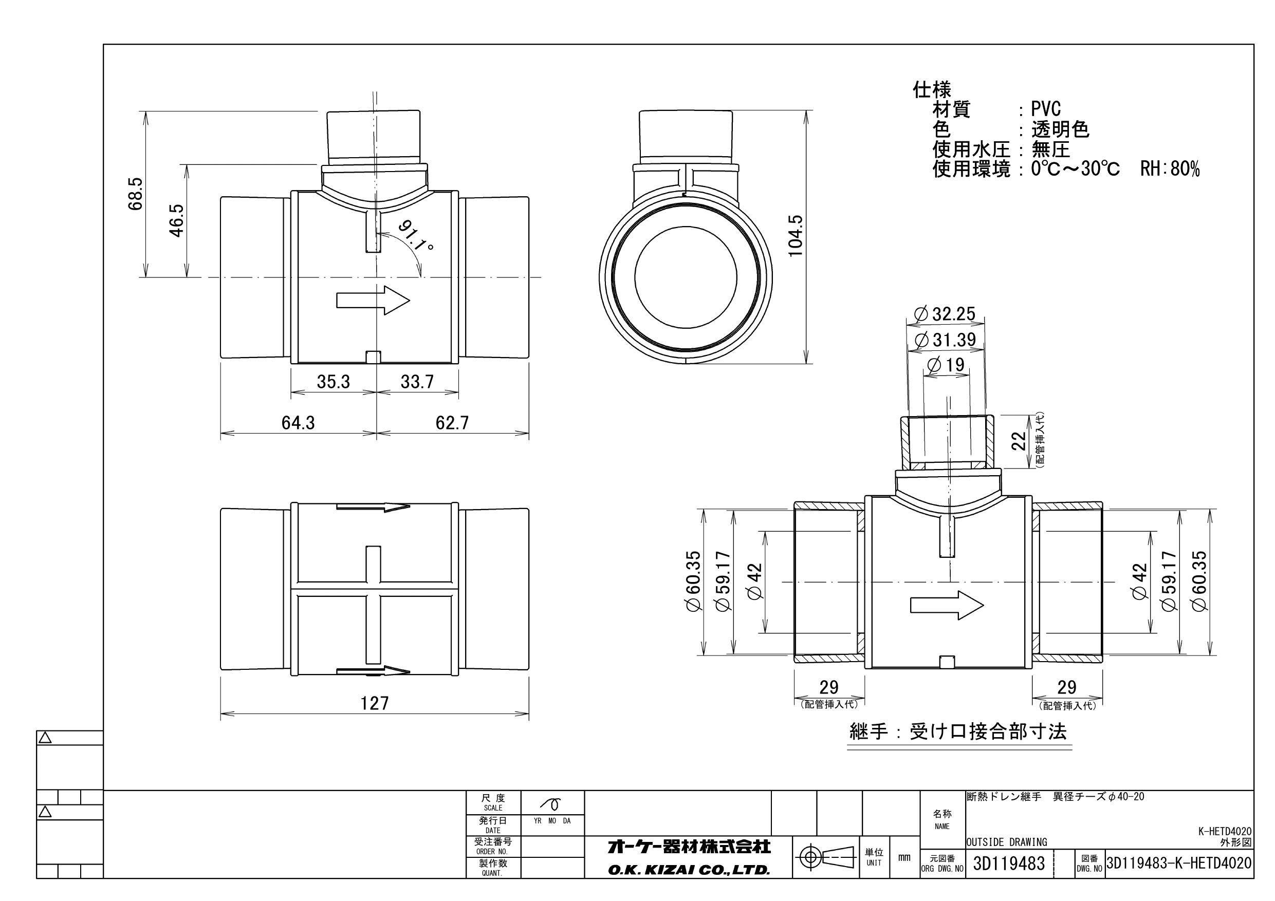 オーケー器材 K-HETD 40X20 K-HETD 断熱ドレン継手 チーズ 40X20 空調部材 断熱ドレン 結露防止層付 00000849476【別送品】