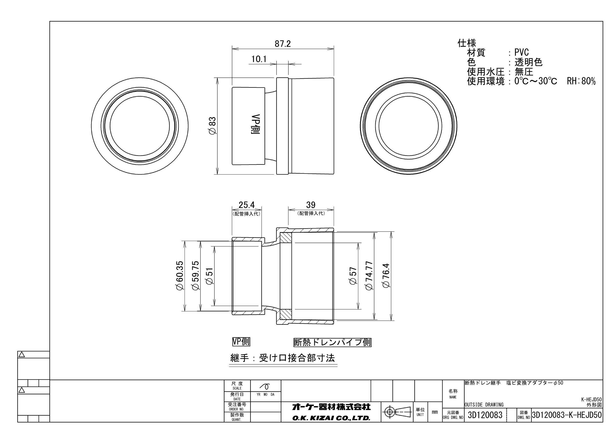オーケー器材 K-HEJD 50 K-HEJD 断熱ドレン継手 塩ビ変換アダプター 50 空調部材 断熱ドレン 結露防止層付 00000849499【別送品】