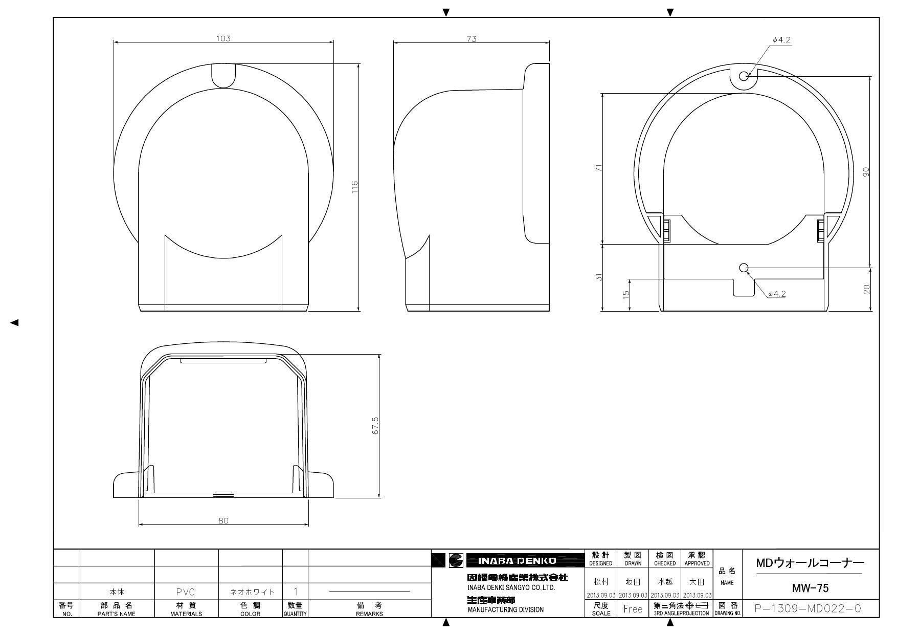 因幡電機産業 MW-75-W スリムダクトMD ウォールコーナー 空調部材 配管化粧カバー MD 00000881838【別送品】