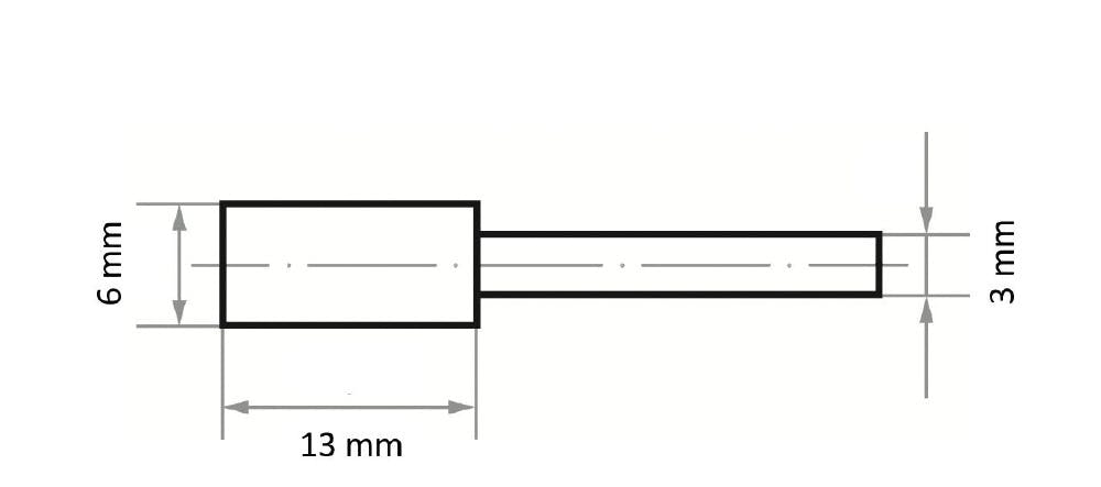 ●砥粒:セラミック●適合材質:チタン、ニッケル合金、工具鋼、ガラス、セラミック●直径(mm):6●高さ(mm):13●推奨回転数(rpm):95,500~159,200●粒度(#):80●軸径(mm):3.0●重量(g):3.2