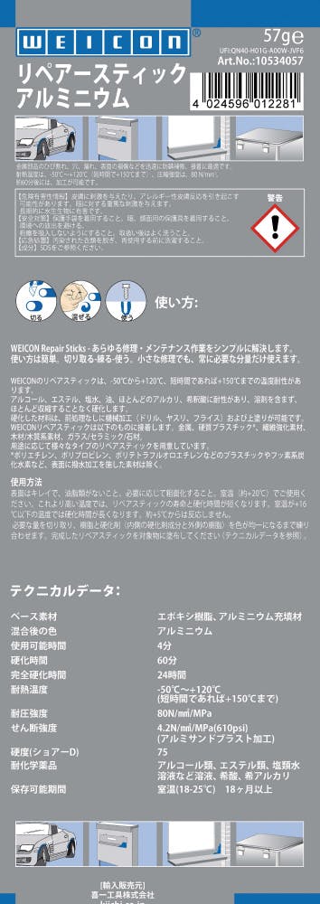 ●使い方は簡単、切り取る・練る・使うの3つで小さな修理でも、常に必要な分量だけ使えます●耐熱温度は、-50℃~120℃(短時間で150℃まで)、圧縮強度は、80N/mm●約60分後には、加工が可能です[使用方法]●必要な量を切り取り、樹脂と硬化剤(内側の硬化剤成分と外側の樹脂)を色が均一になるまで練り合わせます●完成したリペアスティックを対象物に塗布してください(テクニカルデータを参照)