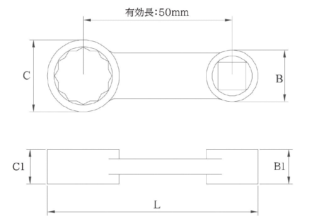 ●差込角(SQ):3/8●材質:クロームバナジウム鋼●サイズ(mm):13●全長(L;mm):69●12角側幅(C;mm):18.6●12角側厚み(C1;mm):8.5●4角側幅(B;mm):17.7●12角側厚み(B1;mm):11.5●質量(g):40●トルクレンチに取り付けて使用します●ソケットではどうしても締められない場所にあるボルト・ナットのトルク管理に大変便利なトルクアダプターです