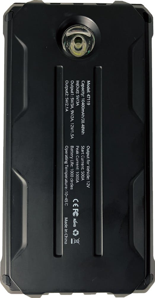 ●製品ライフサイクル:1000回●最大電流(A):1000●バッテリー容量(mAh):10400●USB出力(1):5V/3A・9V/2A・12V/1.5A●USB出力(2):5V/3A●Type-C入出力:5V/3A●充電ポート:Type-C●充電時間(h):約3~4●サイズ(mm):W160XD80XH35●本体重量(g):400