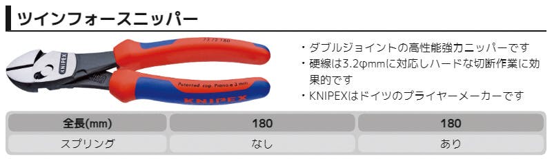 クニペックス ツインフォースニッパー コンフォートハンドル 全長180mm 電線切断 配線作業 細線カット 電工工具 DIY 7372-180 000506182182【別送品】