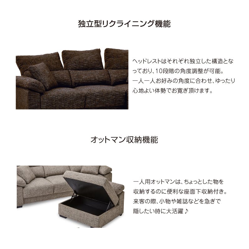 to meet ソファー カローナ2 ブラウン カウチソファー カローナ2 ブラウン リクライニング 三人掛け 3人掛け おしゃれ 収納付 スツール レイアウト自由 布 シェーズロング 3人用 304788 腰サポート クッション付き 多機能【別送品】