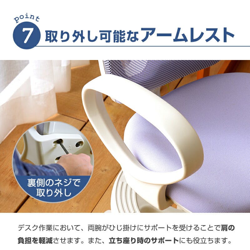座面60kg、モールドウレタン使用、背もたれスライド、耐荷重5kgの簡易フック、座面の耐久性試験5万回クリア、3/4円リング脱着式、シリンダーWDF社製