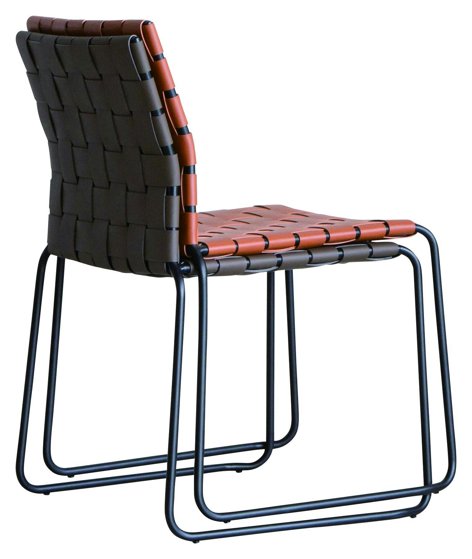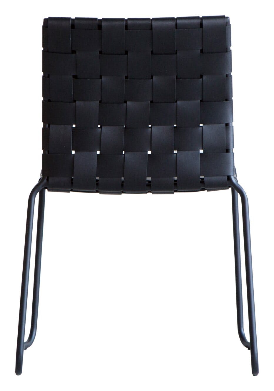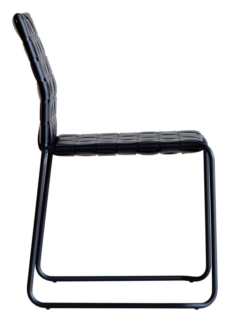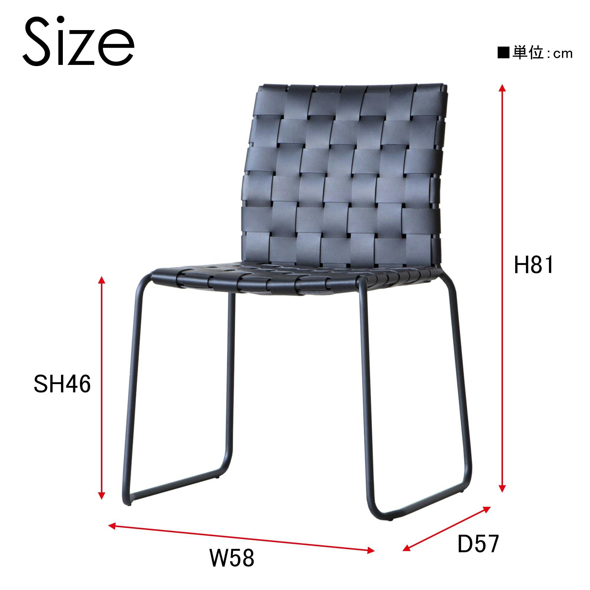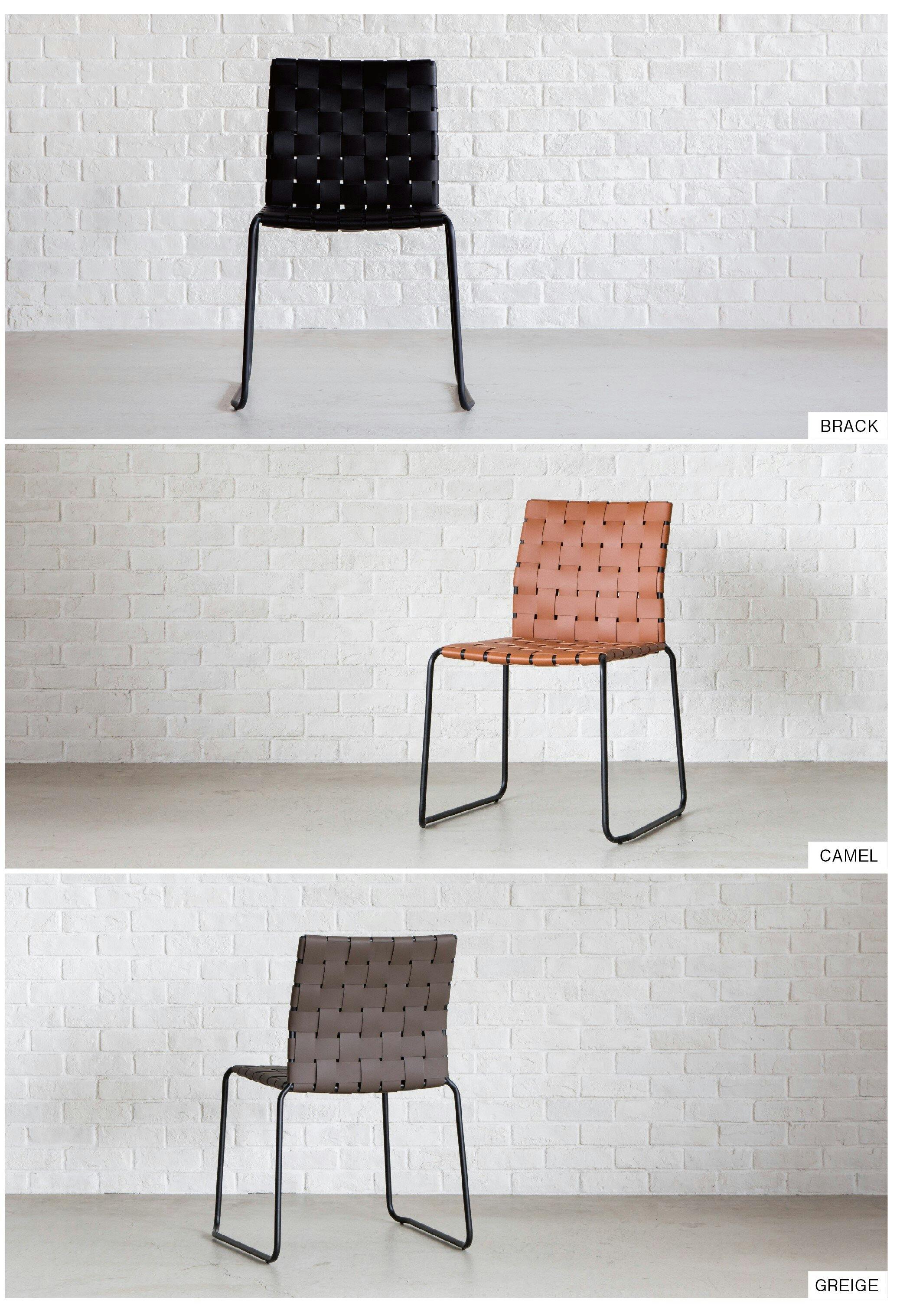 レザーを編みこんだ座面とスチールフレームで構成されたモダンなチェアです。リサイクルレザーは、革の端材等をほぐして樹脂で固めて再生成した天然皮革の雰囲気が味わえつつも、素材も無駄にしないエコロジーな素材です。