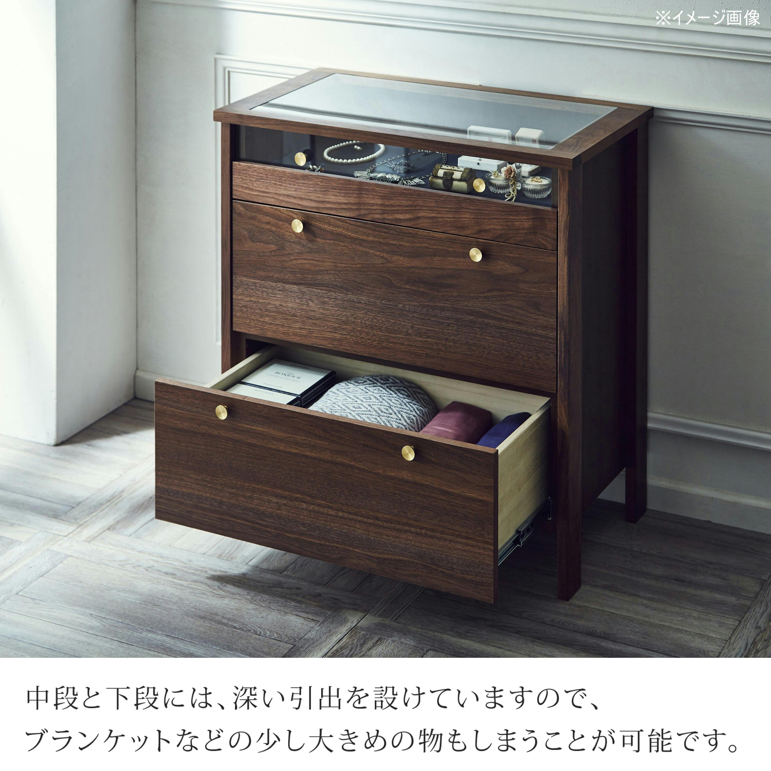 真鍮取っ手を用いた可愛らしいリビングチェストシリーズ ガラス天板を用いたコレクションボードタイプと通常のチェストの2種類あります。