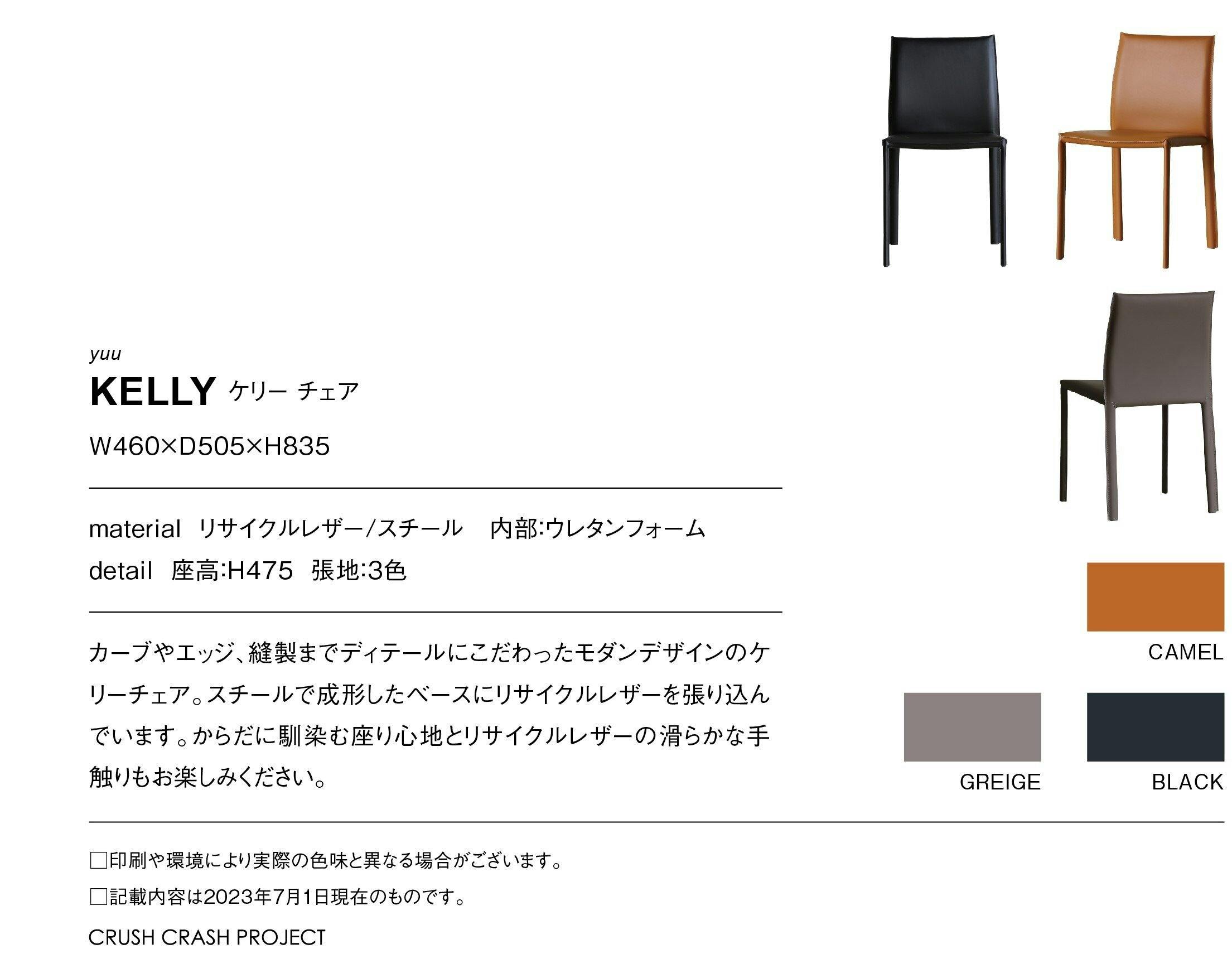 カーブやエッジ、縫製までディテールにこだわったモダンデザインのケリーチェア。スチールで成形したベースにリサイクルレザーを張り込んでいます。からだに馴染む座り心地とリサイクルレザーの滑らかな手触りもお楽しみください。