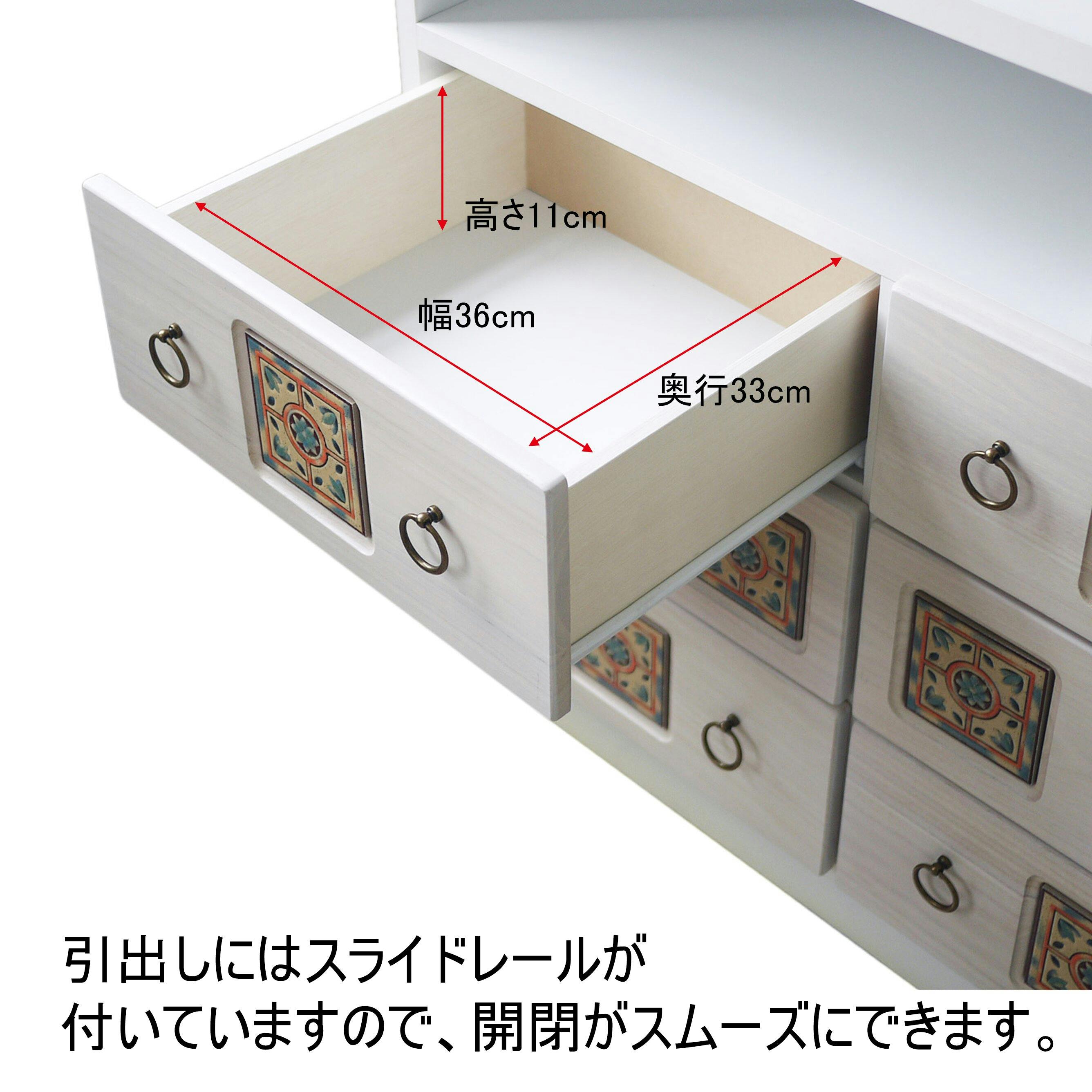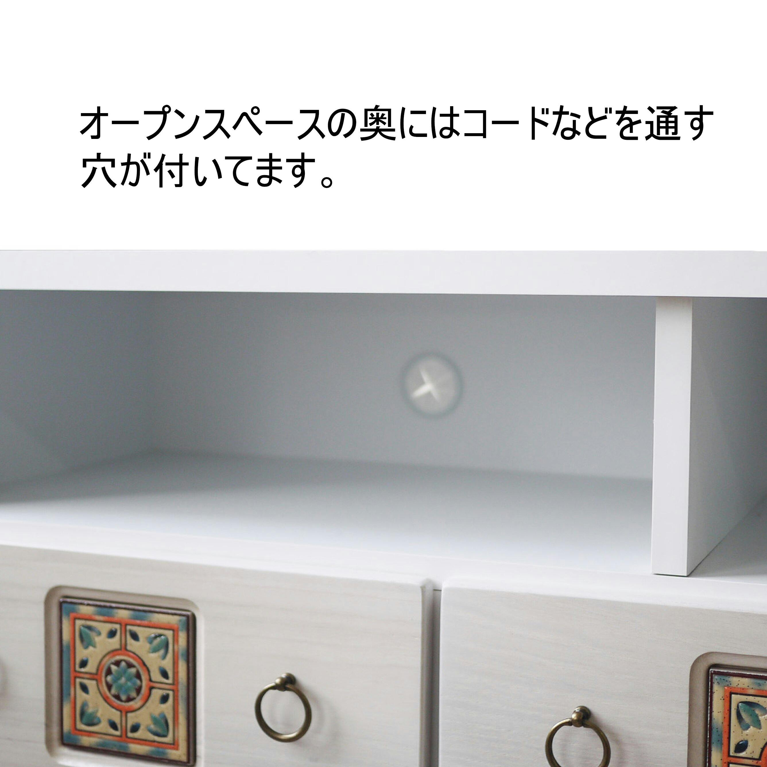 引き出しはオープンレールになっており、スムーズに開閉が可能です。オープンスペース奥には、便利な配線孔付き。1、ナチュラル 2、ブラウン 3、ホワイト ※各色によって別のタイルを使用しております。