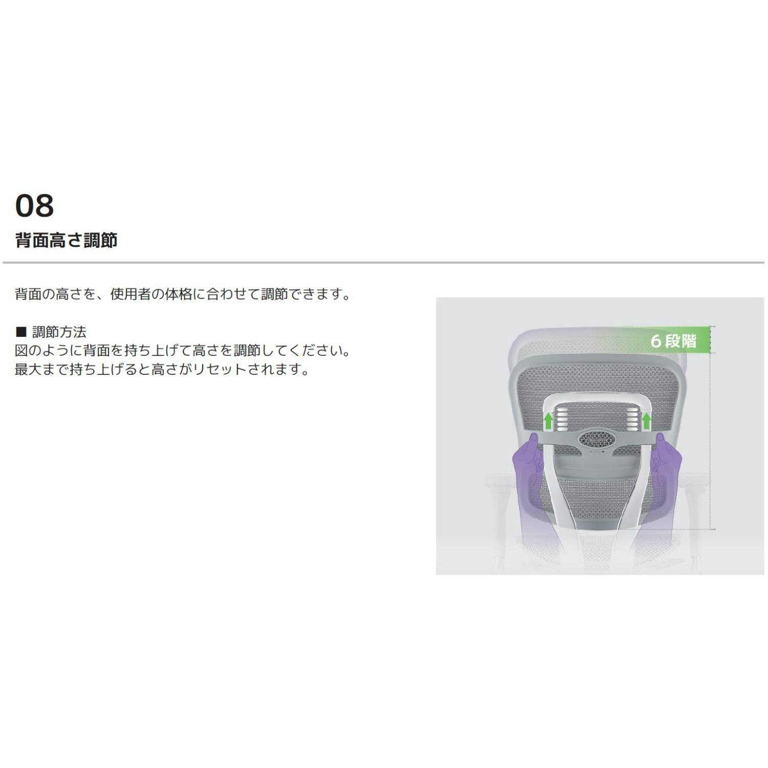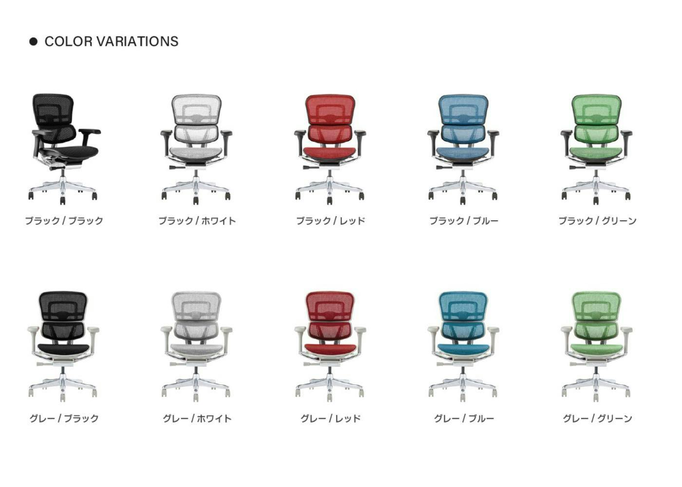 機能:7段階シートスライド機能/座面昇降機能/4段階リクライニング機能/リクライニング硬さ調整機能/4Dアームレスト/バックレスト高さ調整機能/前傾チルト機能/ランバーサポートテンション調整機能/メモリーロッキング機能フレームはブラックとグレーの2色から選べます。メッシュ生地はブラック/ホワイト/レッド/ブルー/グリーンの5色から選べます。