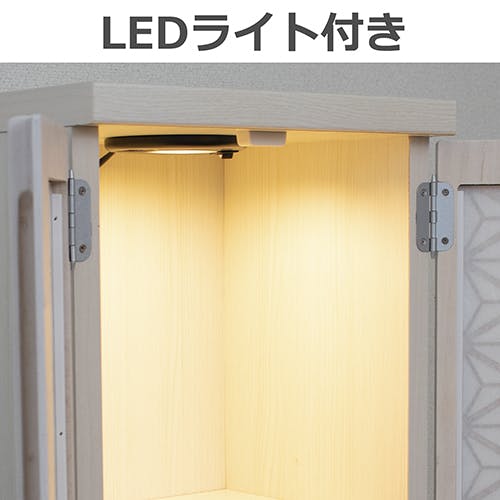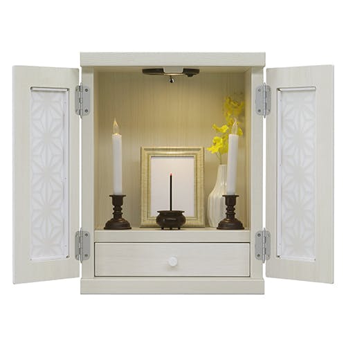 インテリアに馴染みやすいモダン調の仏壇です。小窓に美しい模様を取り入れ、和紙を張り付けておりますので、内部のLEDが美しく紋様を照らし出します。引き出しには思い出の品も収納できます。