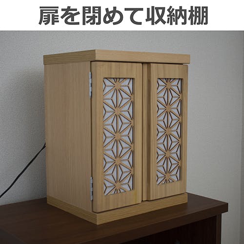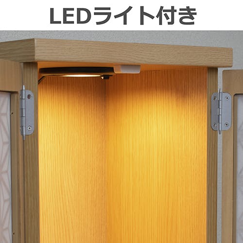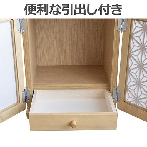 インテリアに馴染みやすいモダン調の仏壇です。小窓に美しい模様を取り入れ、和紙を張り付けておりますので、内部のLEDが美しく紋様を照らし出します。引き出しには思い出の品も収納できます。