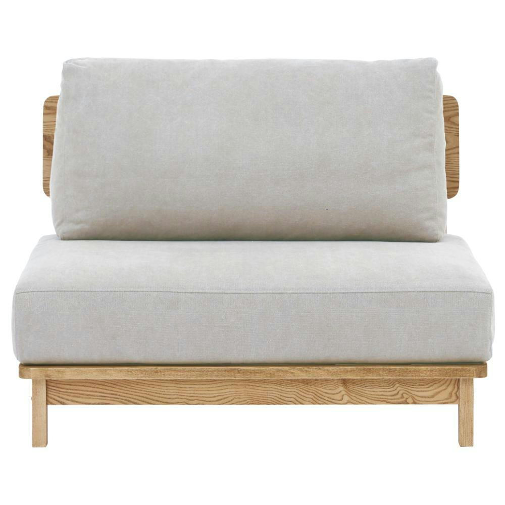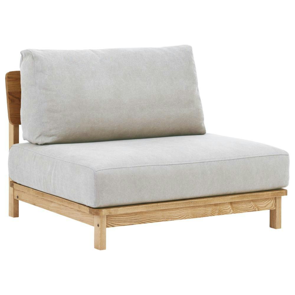 帆布生地を使用した厚めのクッションにアッシュ材の無垢を使用したスノコタイプのフレームを合わせ、シンプルでお部屋に合わせやすいソファ。背面もきれいな仕上げでお部屋の真ん中に置けます。