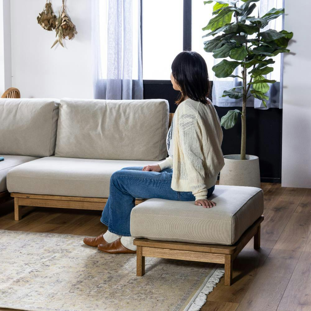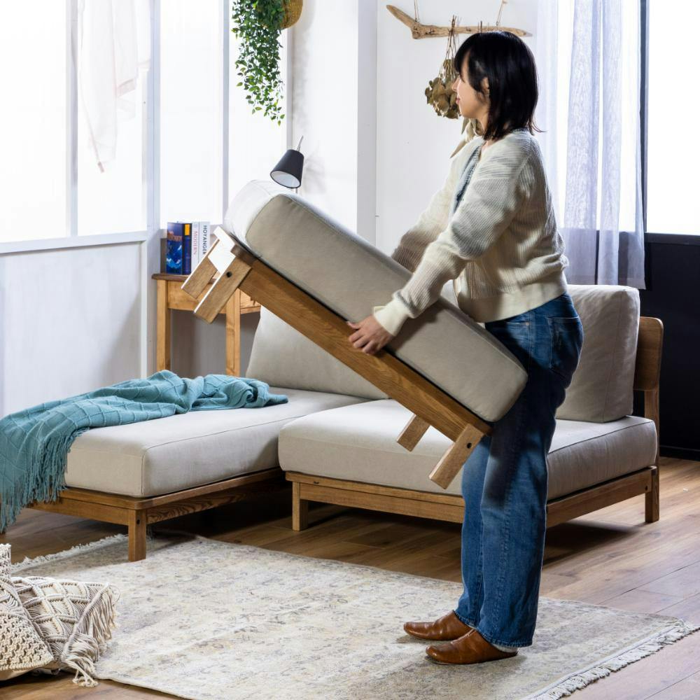 帆布生地を使用した厚めのクッションにアッシュ材の無垢を使用したスノコタイプのフレームを合わせ、シンプルでお部屋に合わせやすいソファ。背面もきれいな仕上げでお部屋の真ん中に置けます。