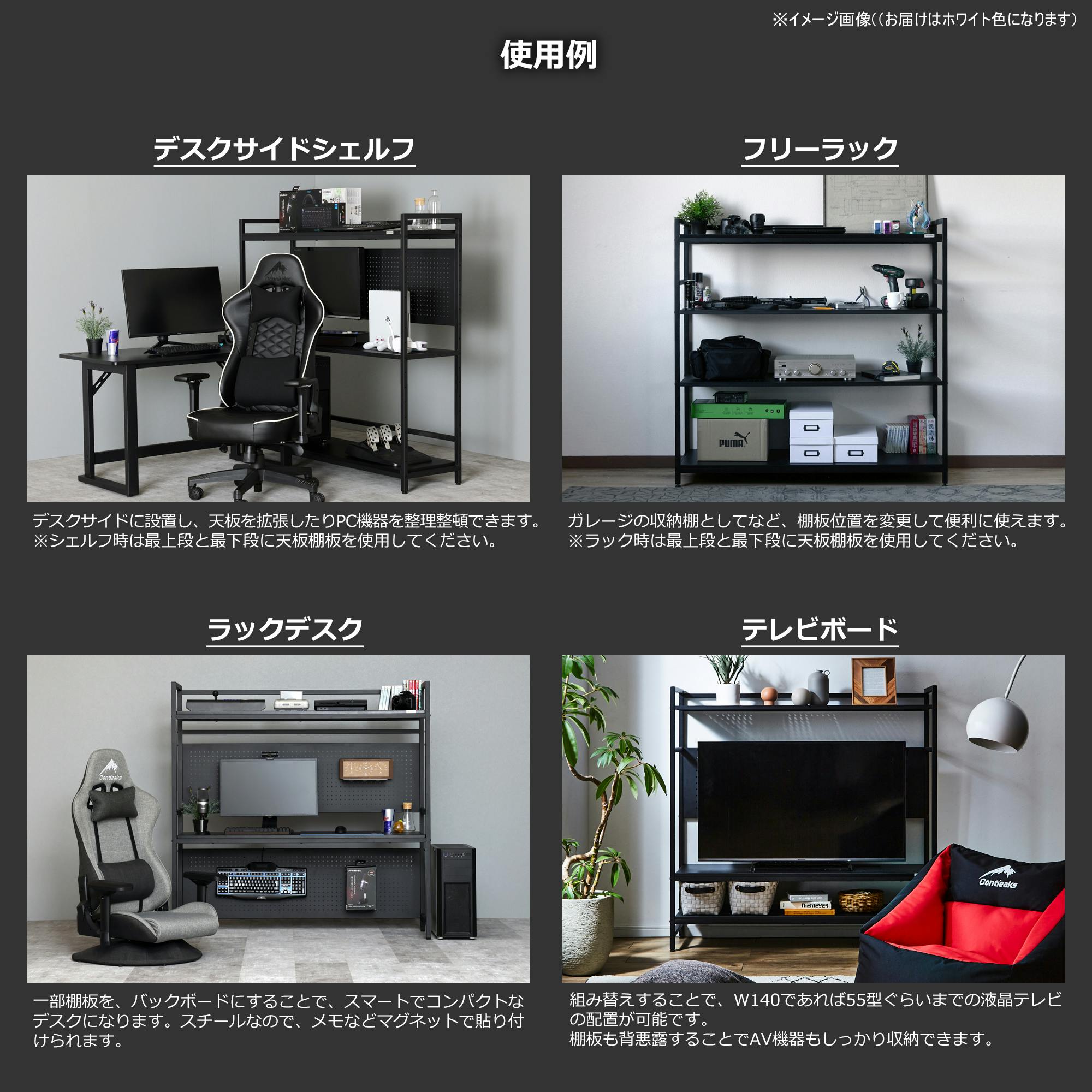 棚板を組み替えて、用途に合わせてラック・デスク・TVボードになるゲーミングラック。棚板は、18段階75mmピッチで高さ調節が可能。天板棚板とパンチングスチール棚板の二種類があり。パンチングスチール棚板は、背板にすることで有孔ボードと同じようにフックなどで飾り収納にできます。