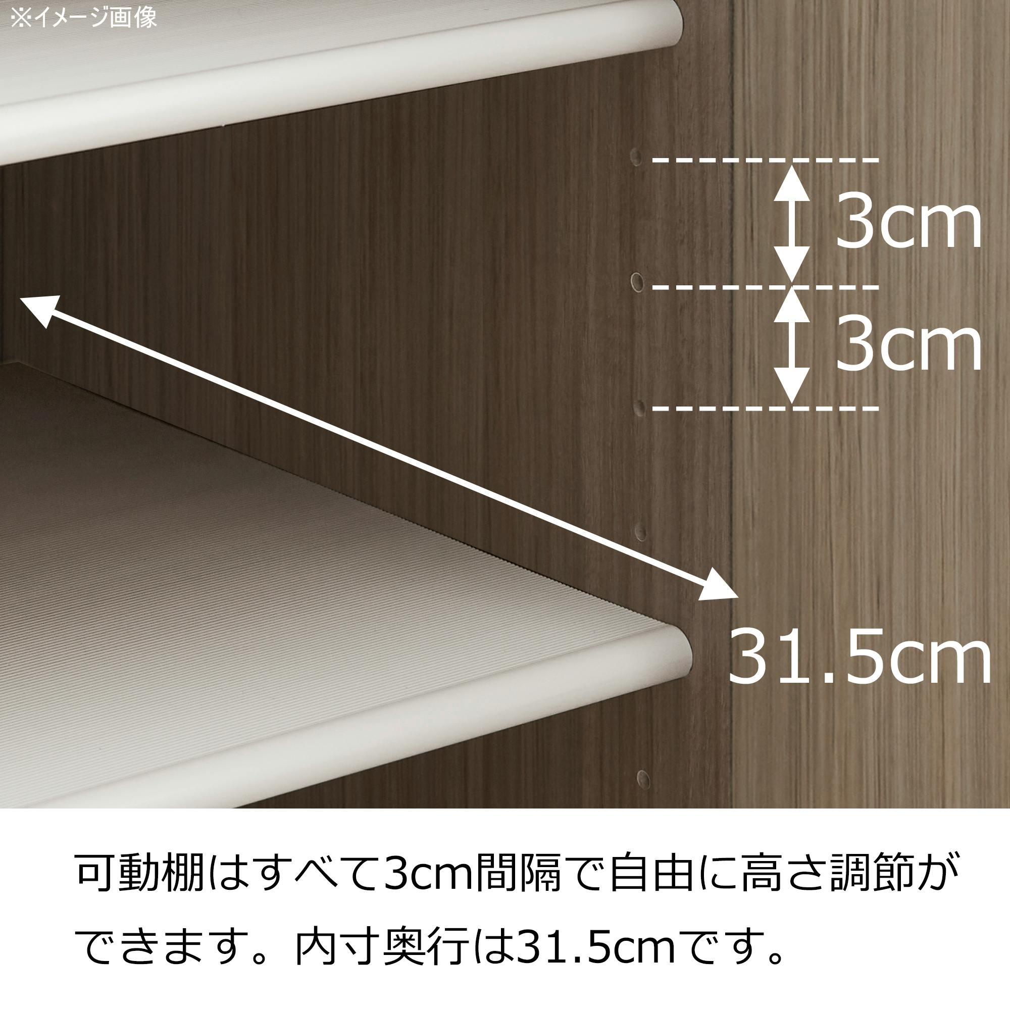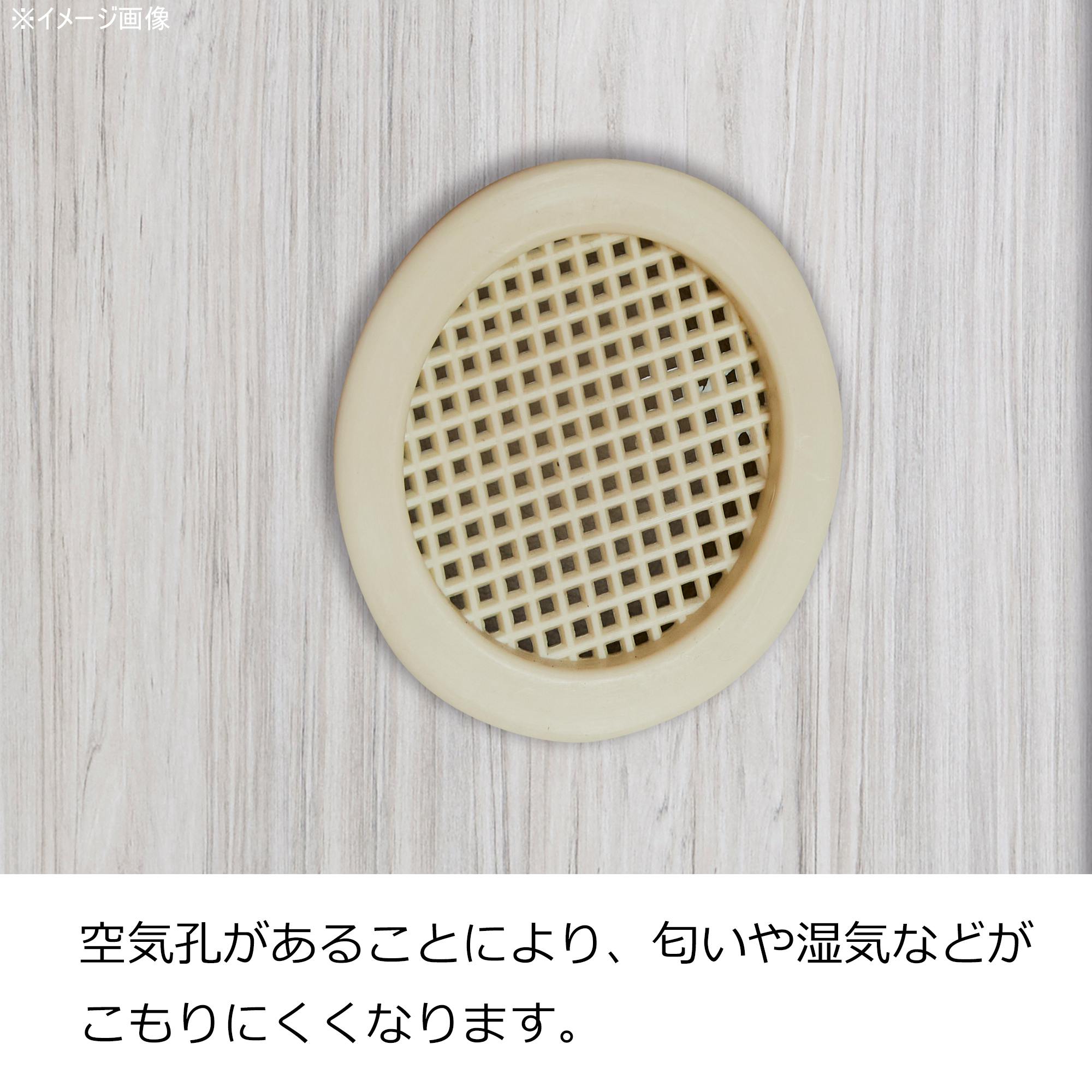 掃除のしやすい脚付き。湿気や臭いに対策した空気孔付き。内部奥行き31.5cm。棚板は洗いやすいプラスチック製。棚板は3cmピッチで高さ変更が可能。