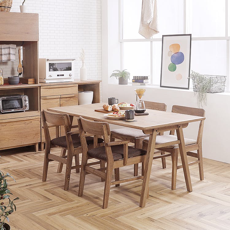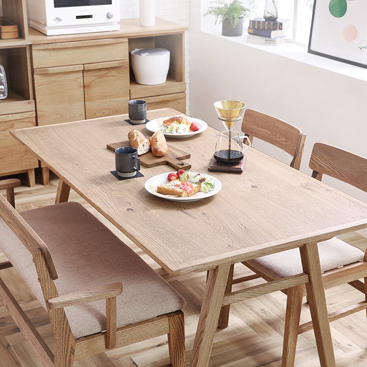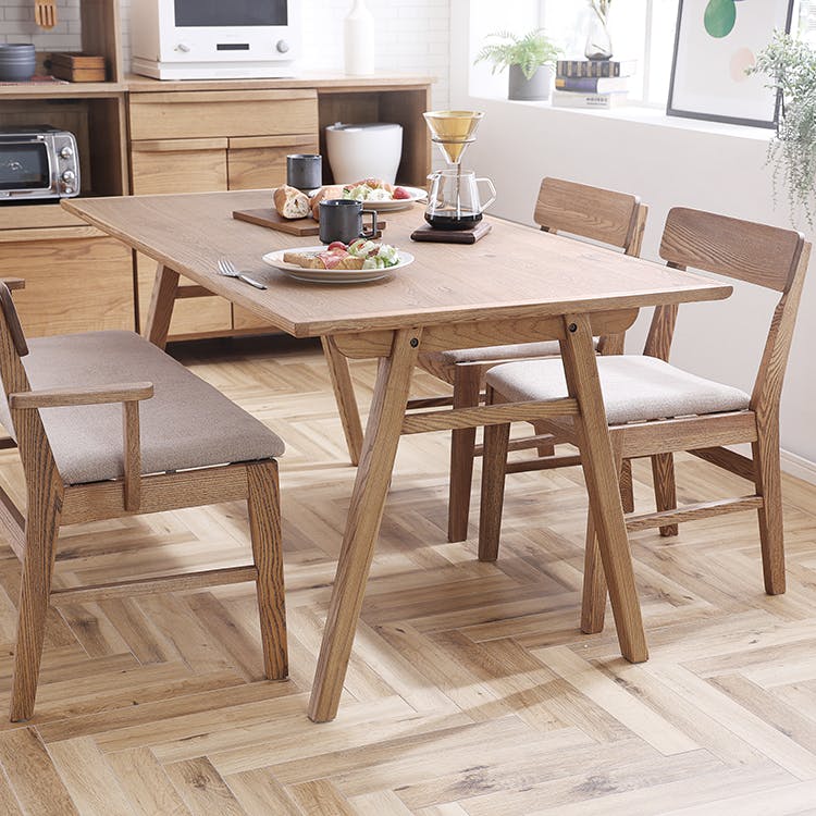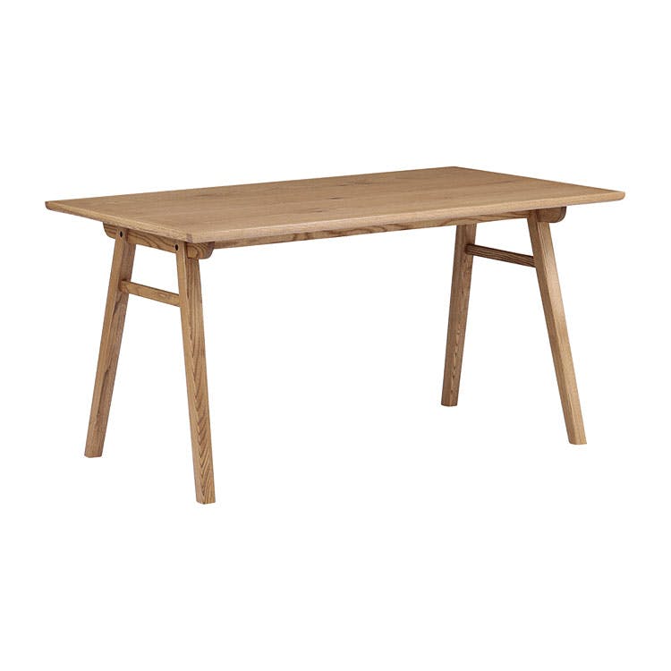 ハの字脚で出入りしやすいシンプルデザインのダイニングテーブルです。小口面を丸く仕上げているため、お子様のいるご家庭でも安心してご使用いただけます。