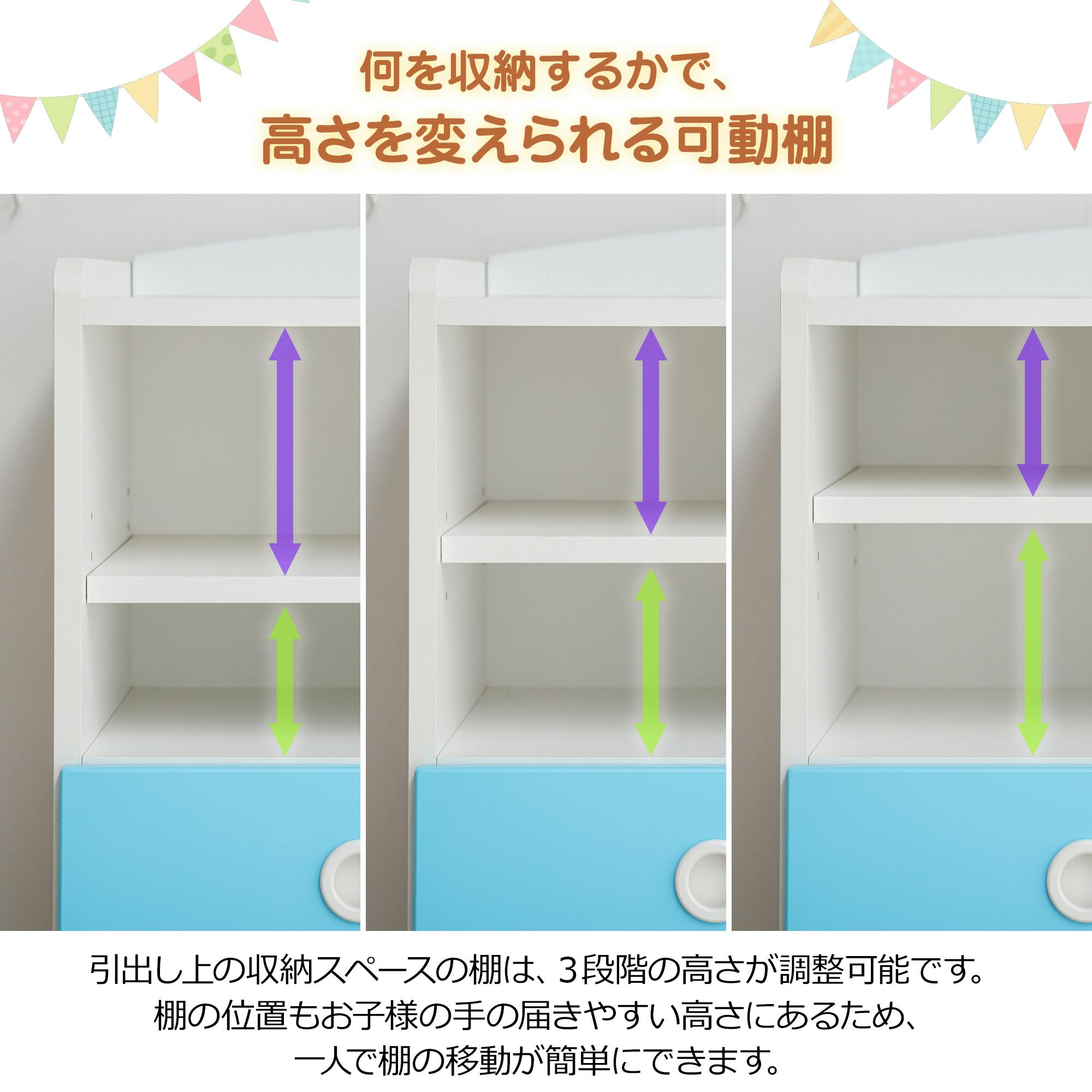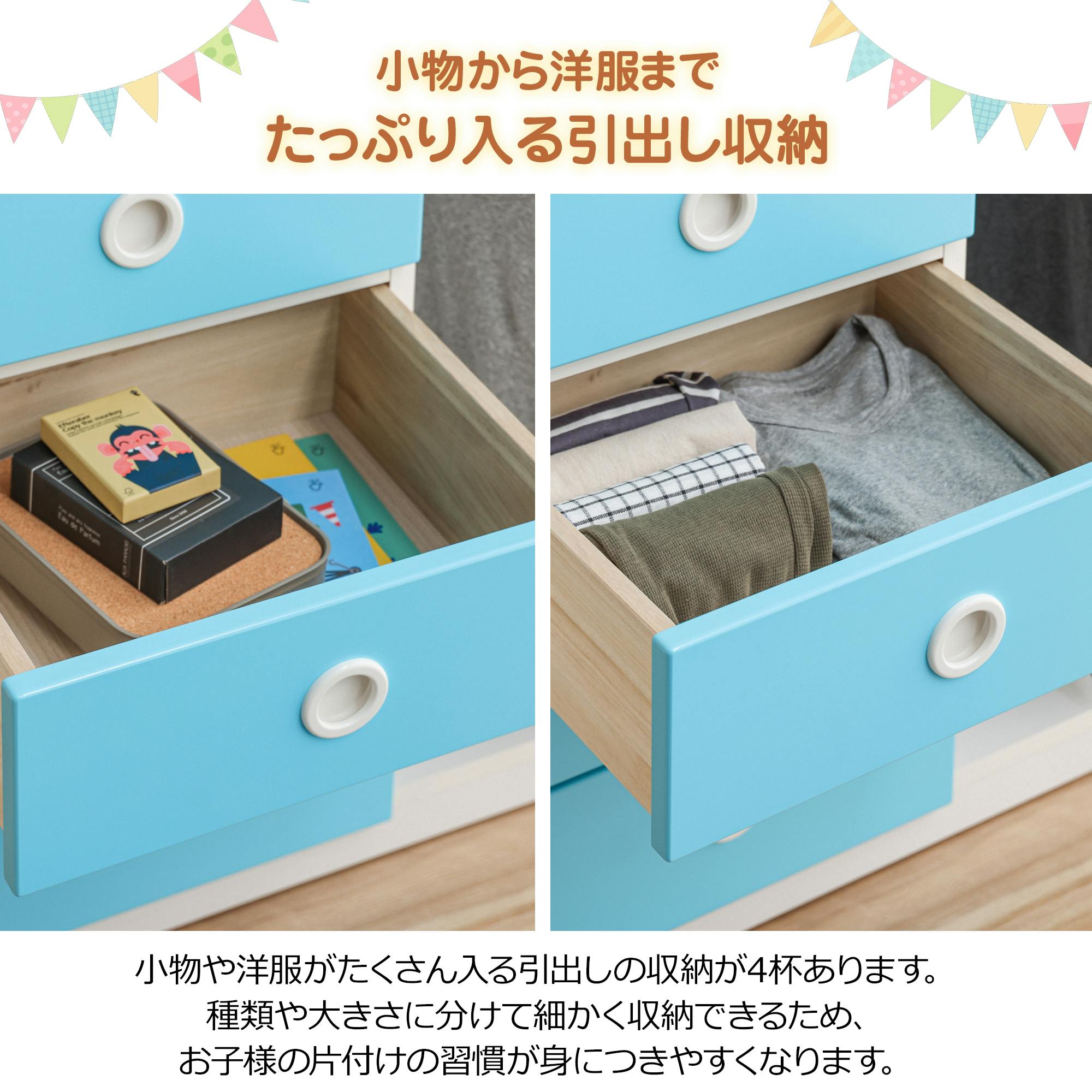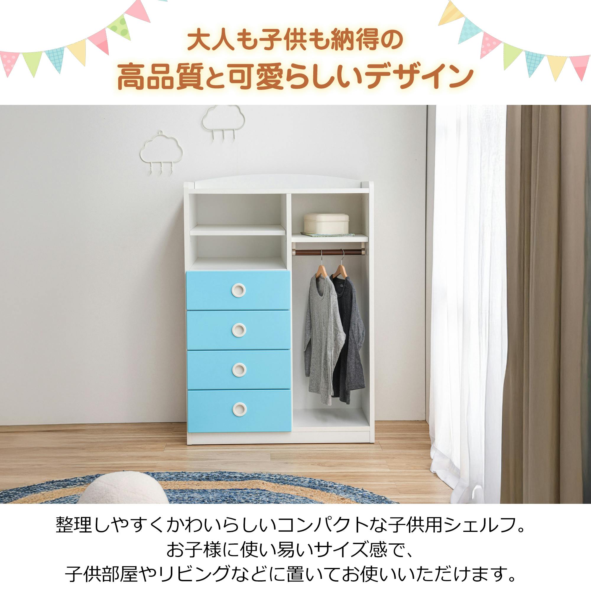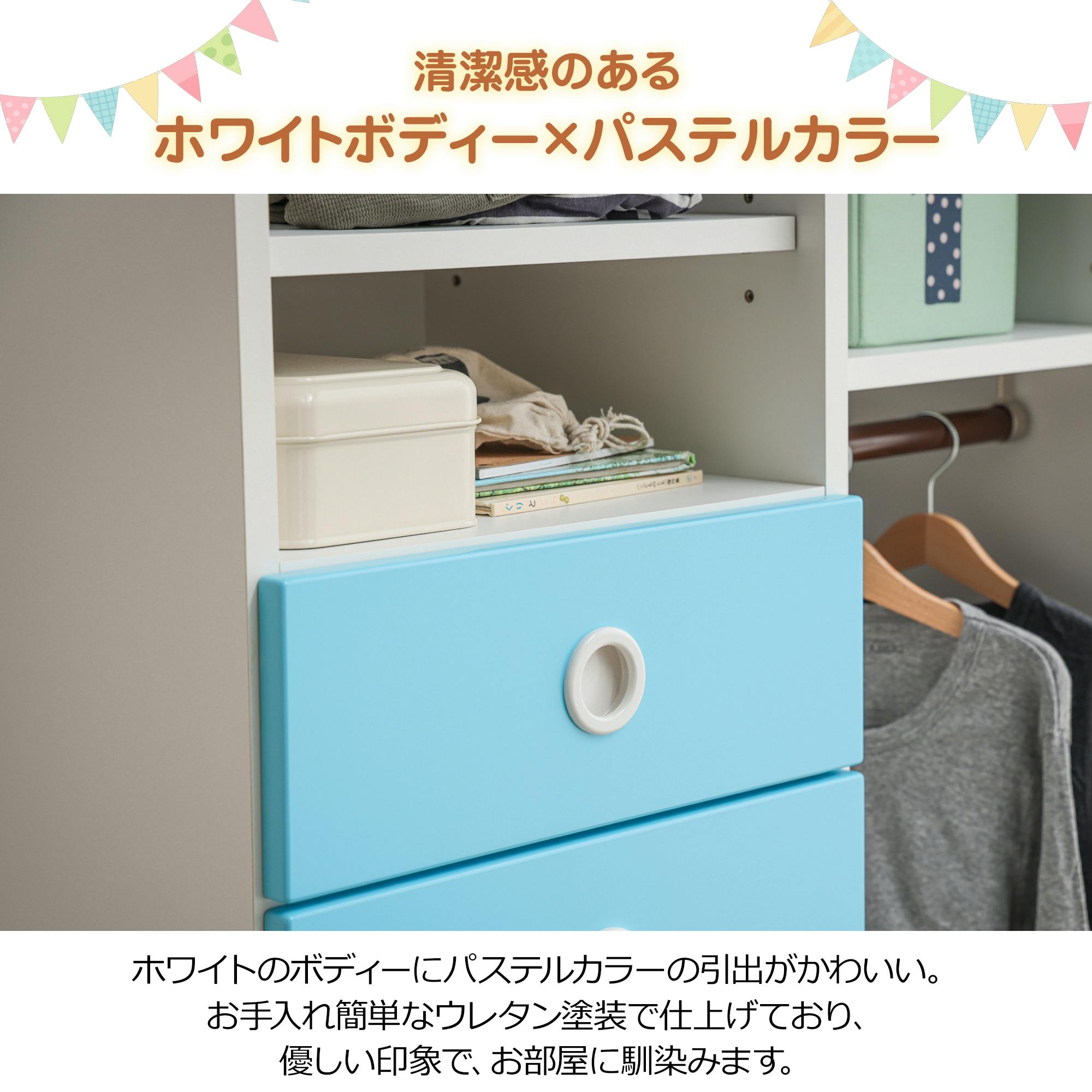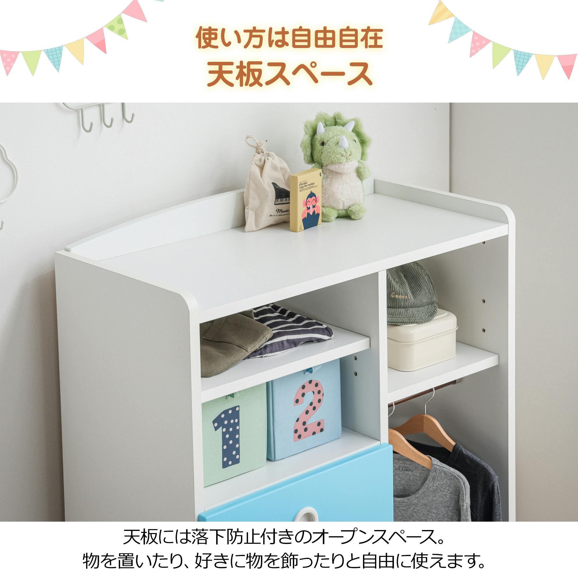 自分でおかたづけするのが楽しくなるような、キュートな色合いの収納です。ハンガー掛けもついて、明日着ていくお洋服も準備できます。