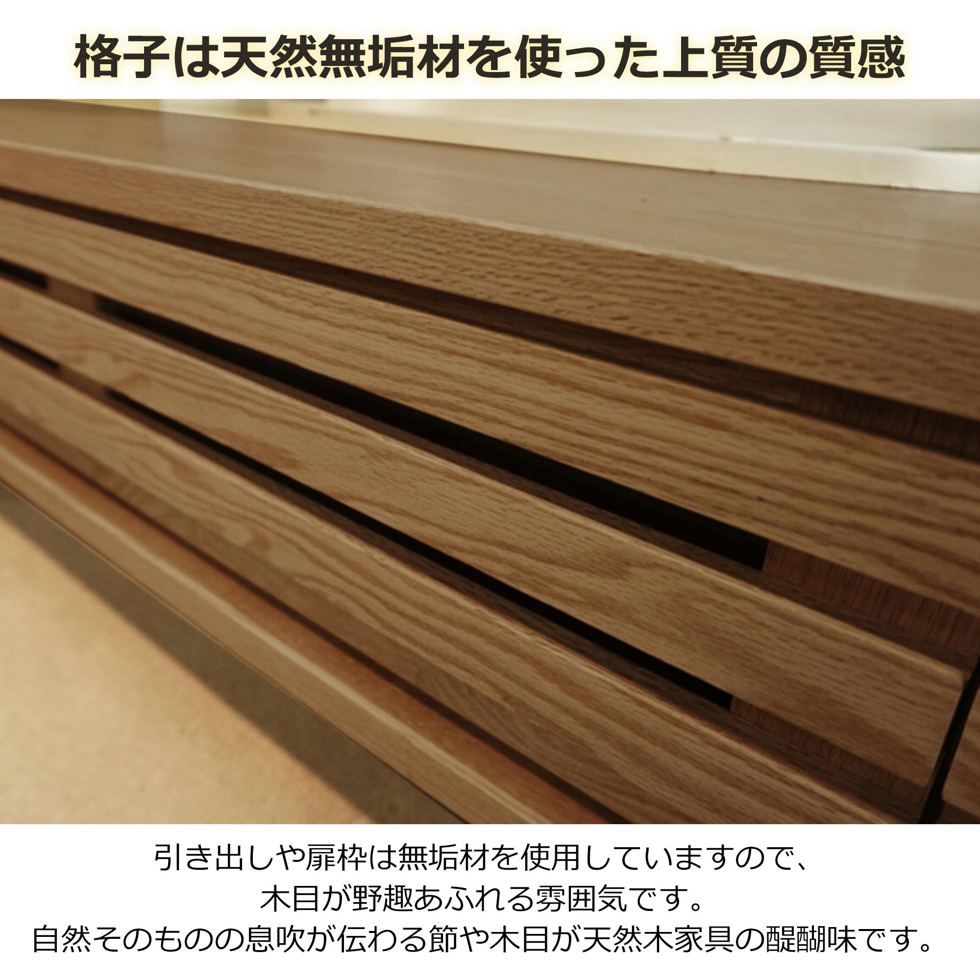 前板一面に格子のデザインが入っており、高級感があります。内部の引き出しはフルオープンレール仕様。脚付きで掃除がしやすい作りになっております。