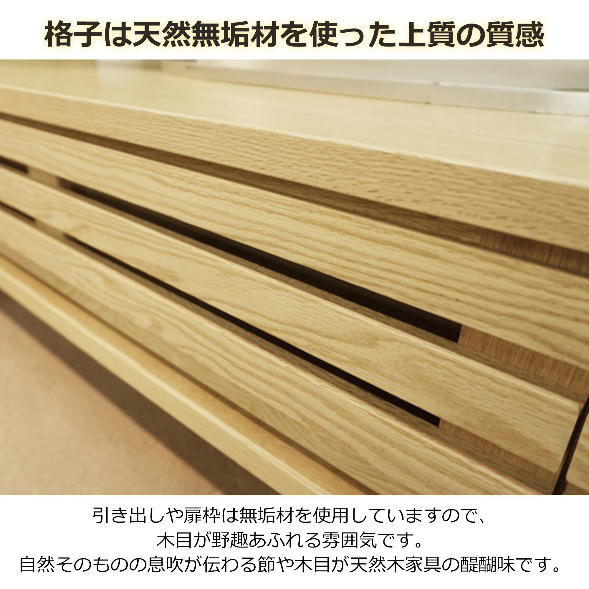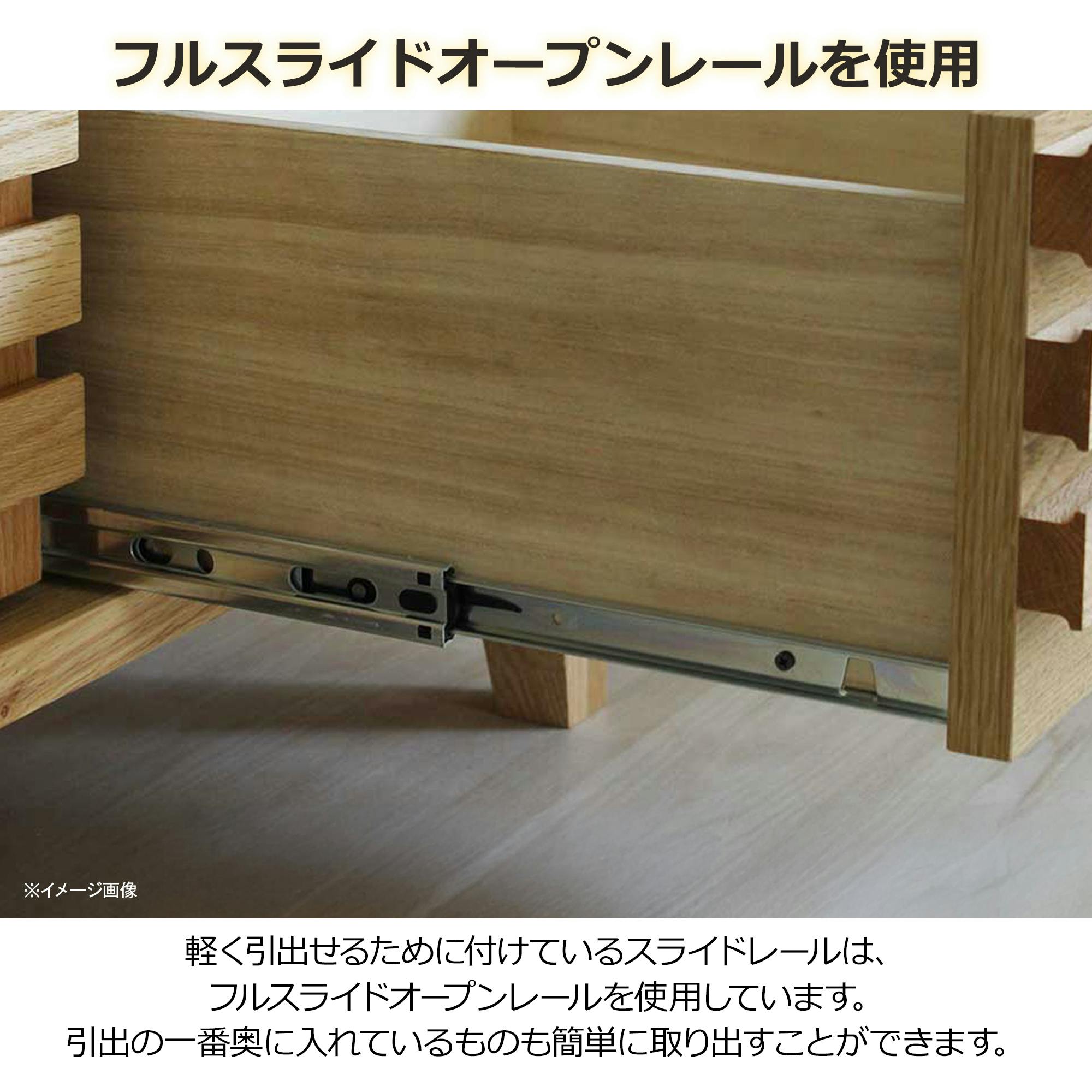 前板一面に格子のデザインが入っており、高級感があります。内部の引き出しはフルオープンレール仕様。脚付きで掃除がしやすい作りになっております。