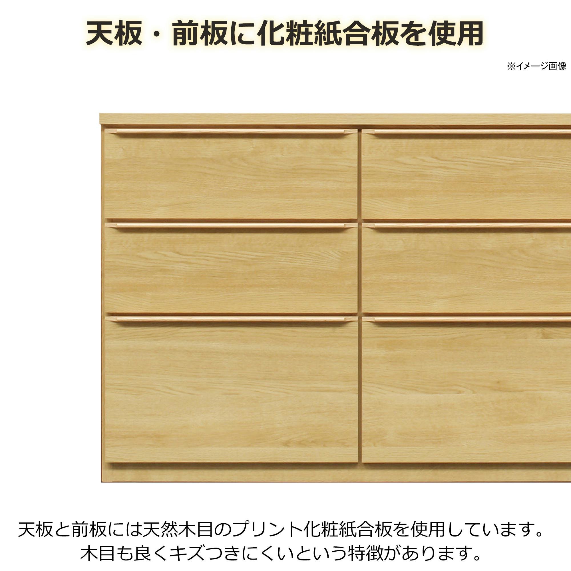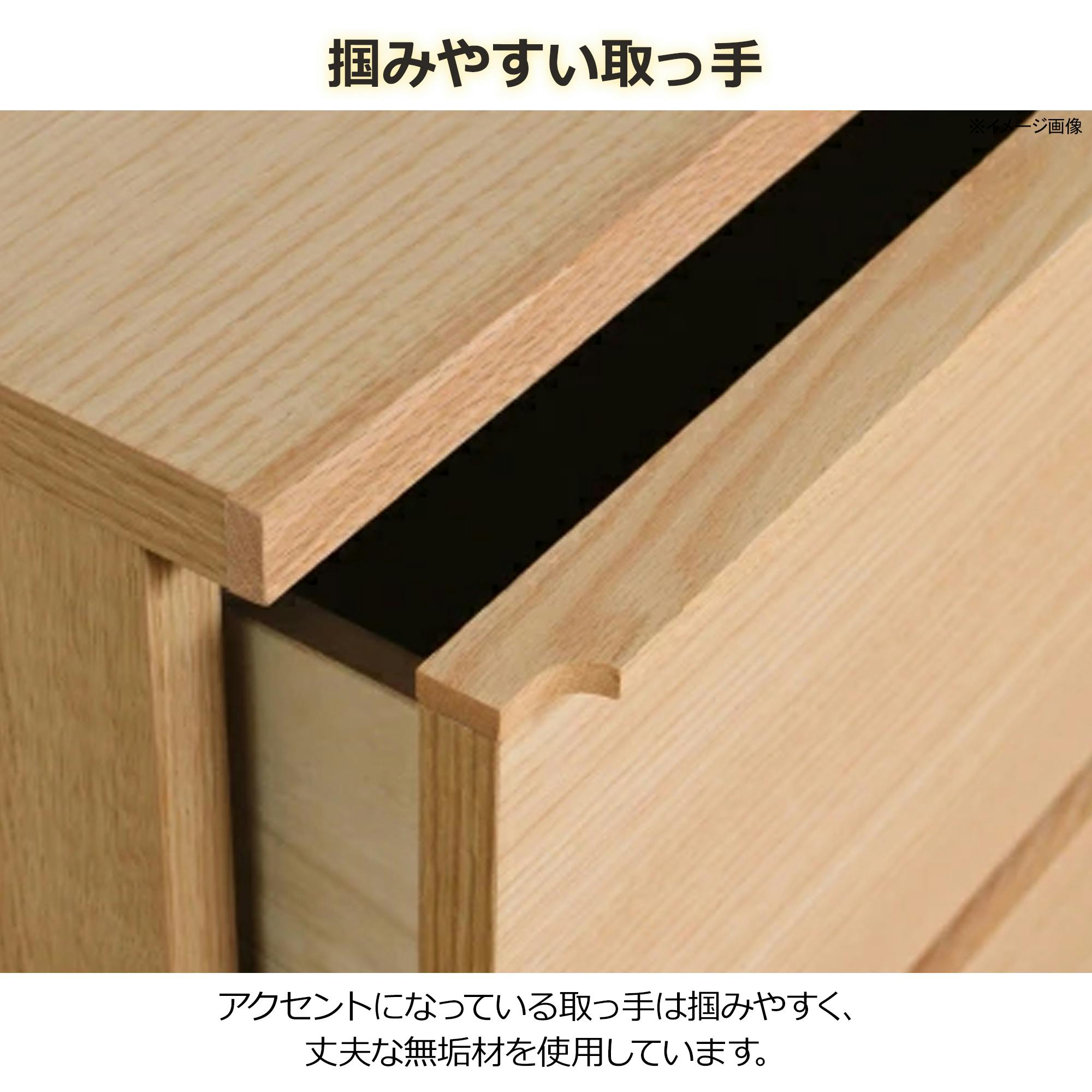 天板と前板には天然木目のプリント化粧紙合板を採用。取手には無垢材を採用。