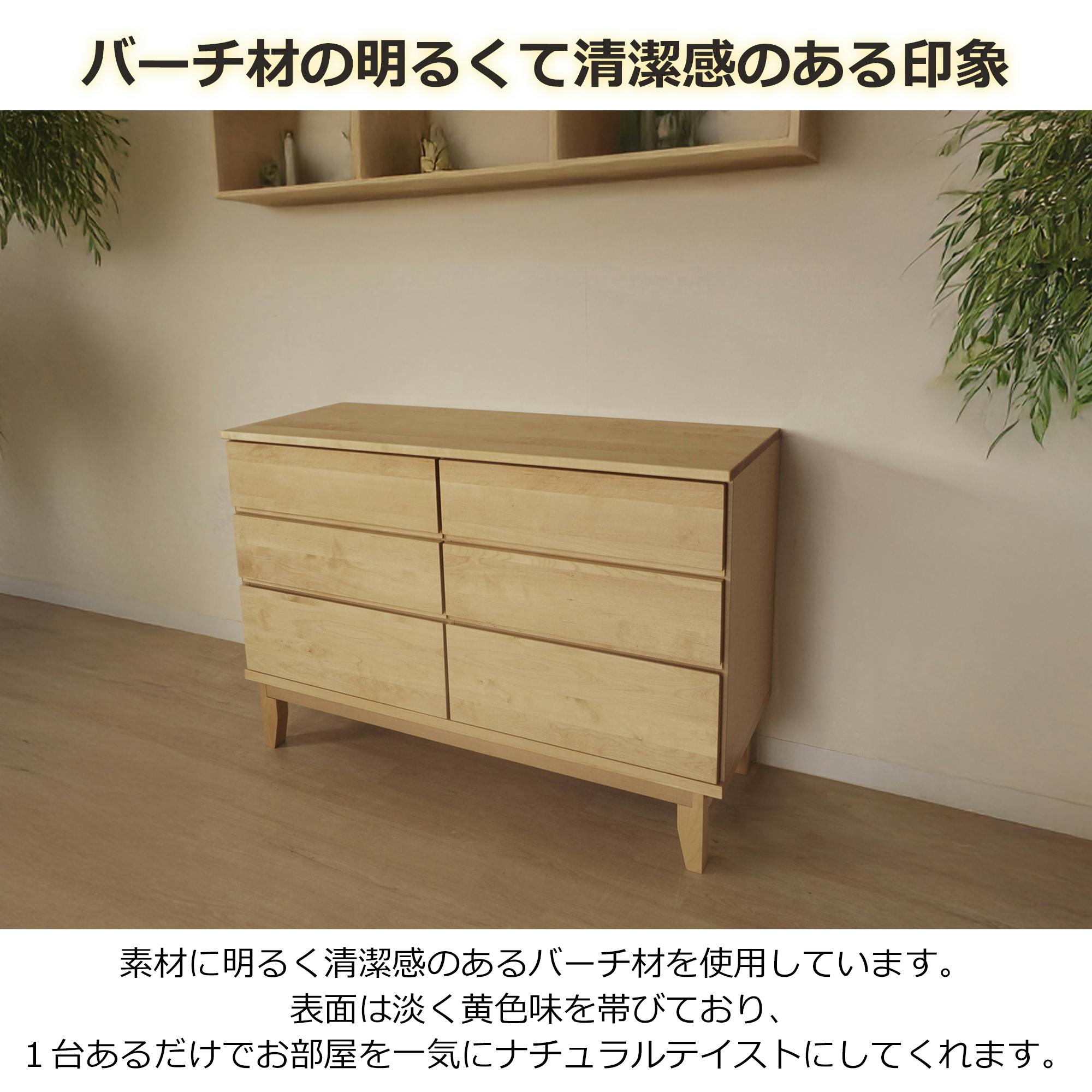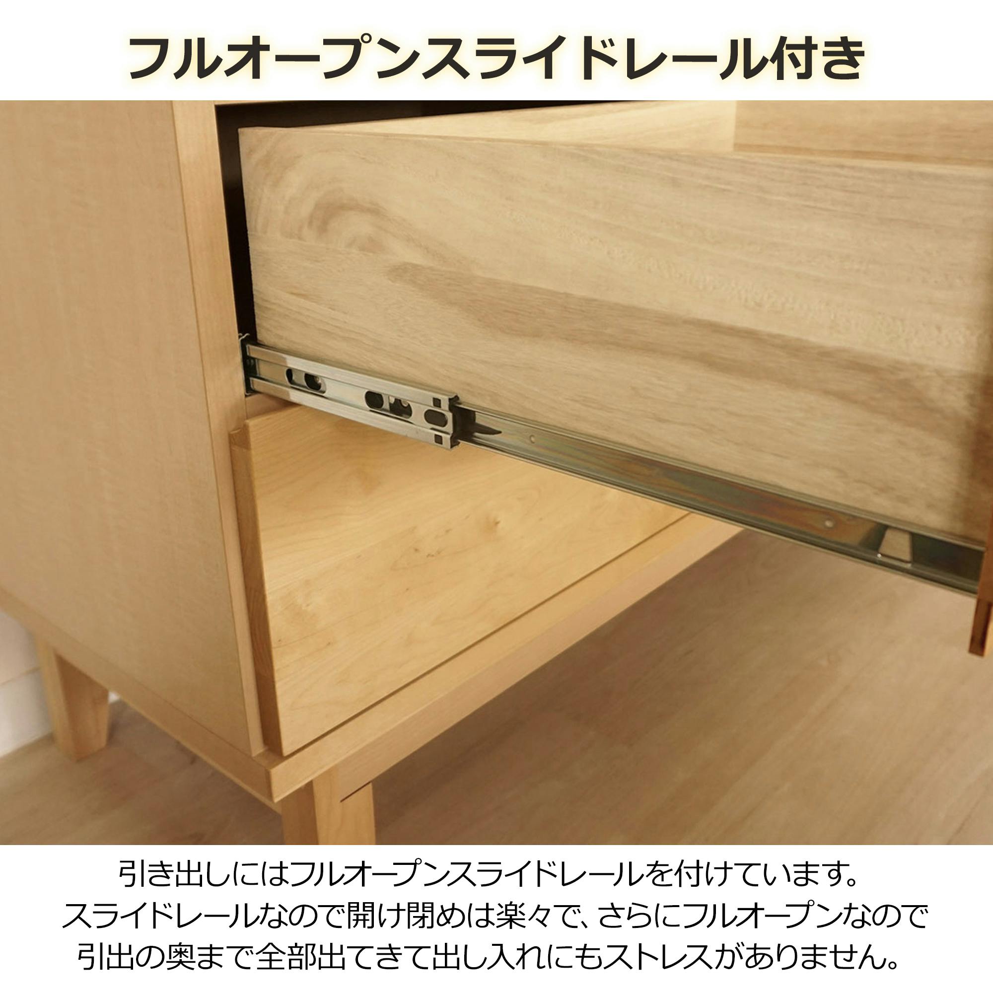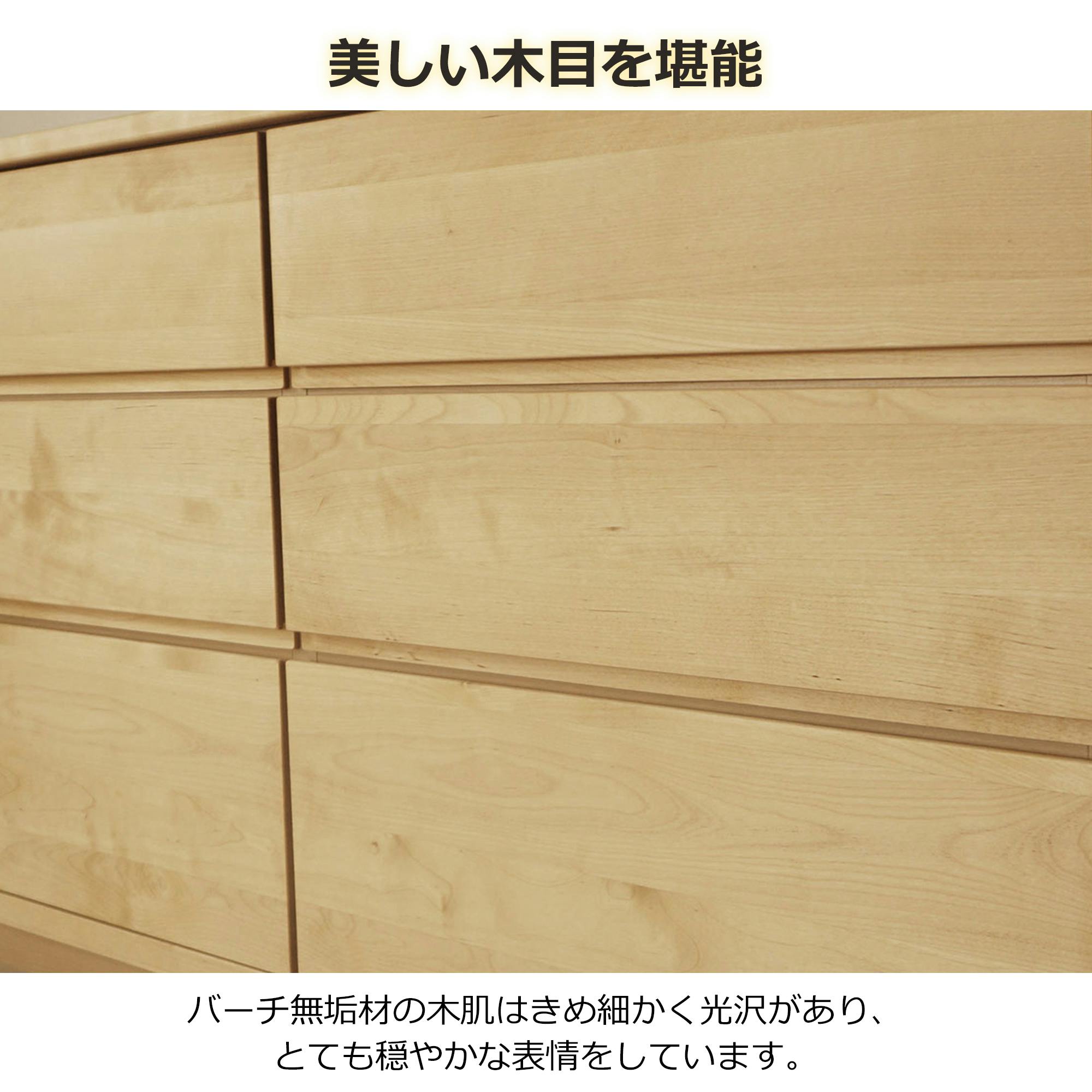 バーチ無垢材を天板と前板に使用し、木の温かみがありながらも高級感あふれる仕上がりとなっております。黄色みが薄く、白系に近いために明るい印象のナチュラルなお部屋づくりに最適です。
