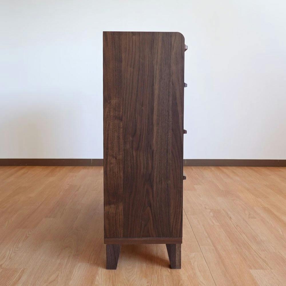 天板の周囲に囲いがあるため、置物が落ちにくい作りとなっております。取手は形にこだわり、また無垢材を採用しております。