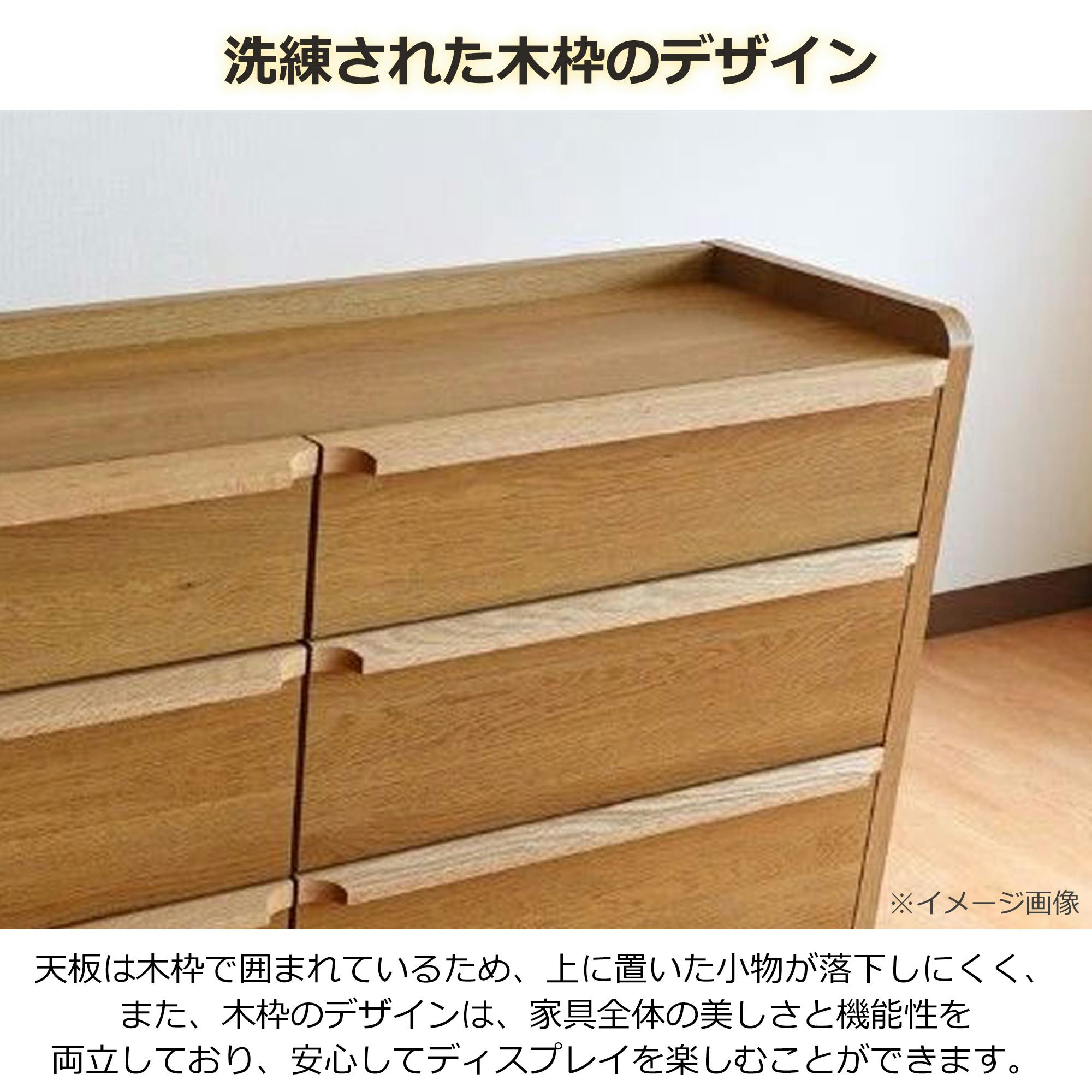 天板の周囲に囲いがあるため、置物が落ちにくい作りとなっております。取手は形にこだわり、また無垢材を採用しております。
