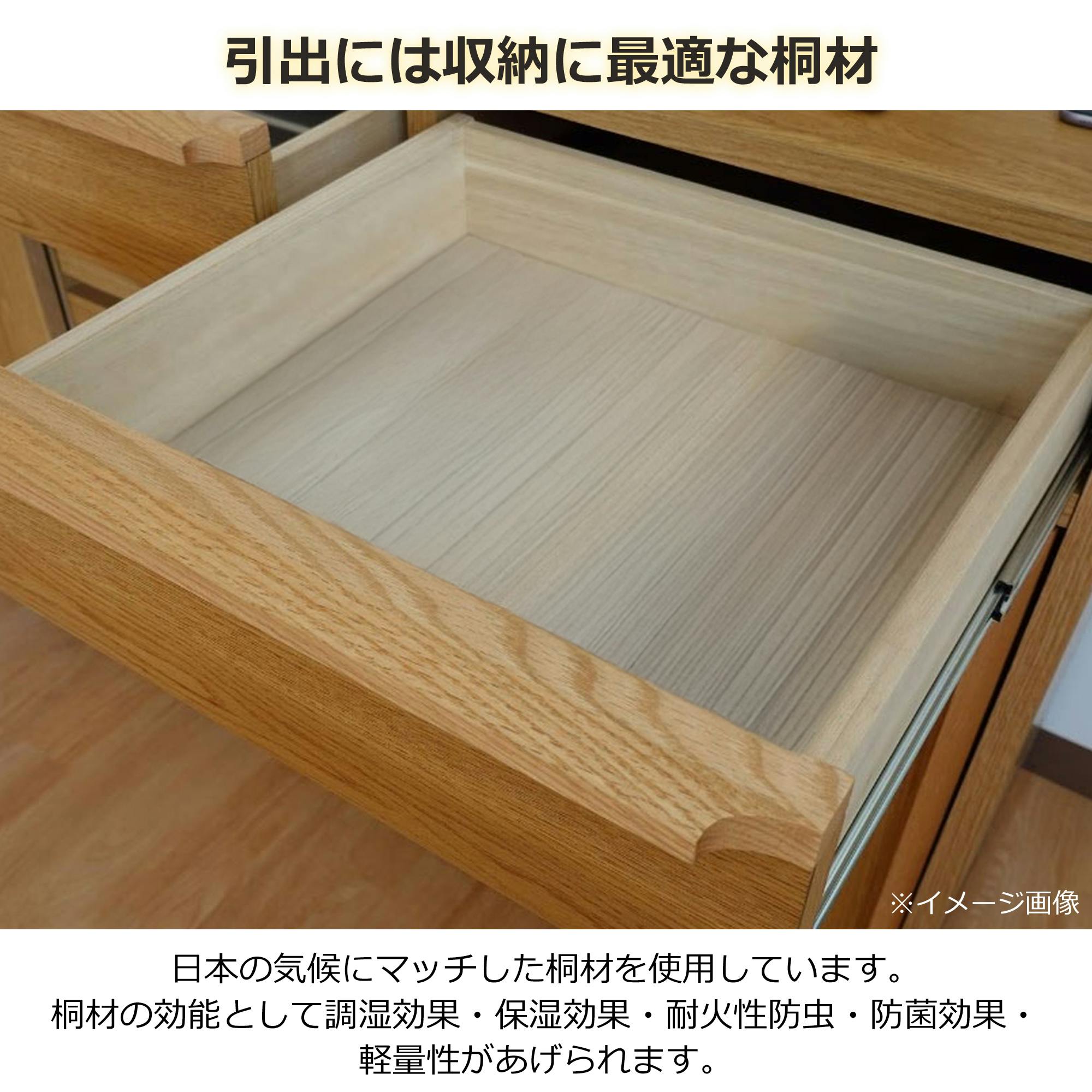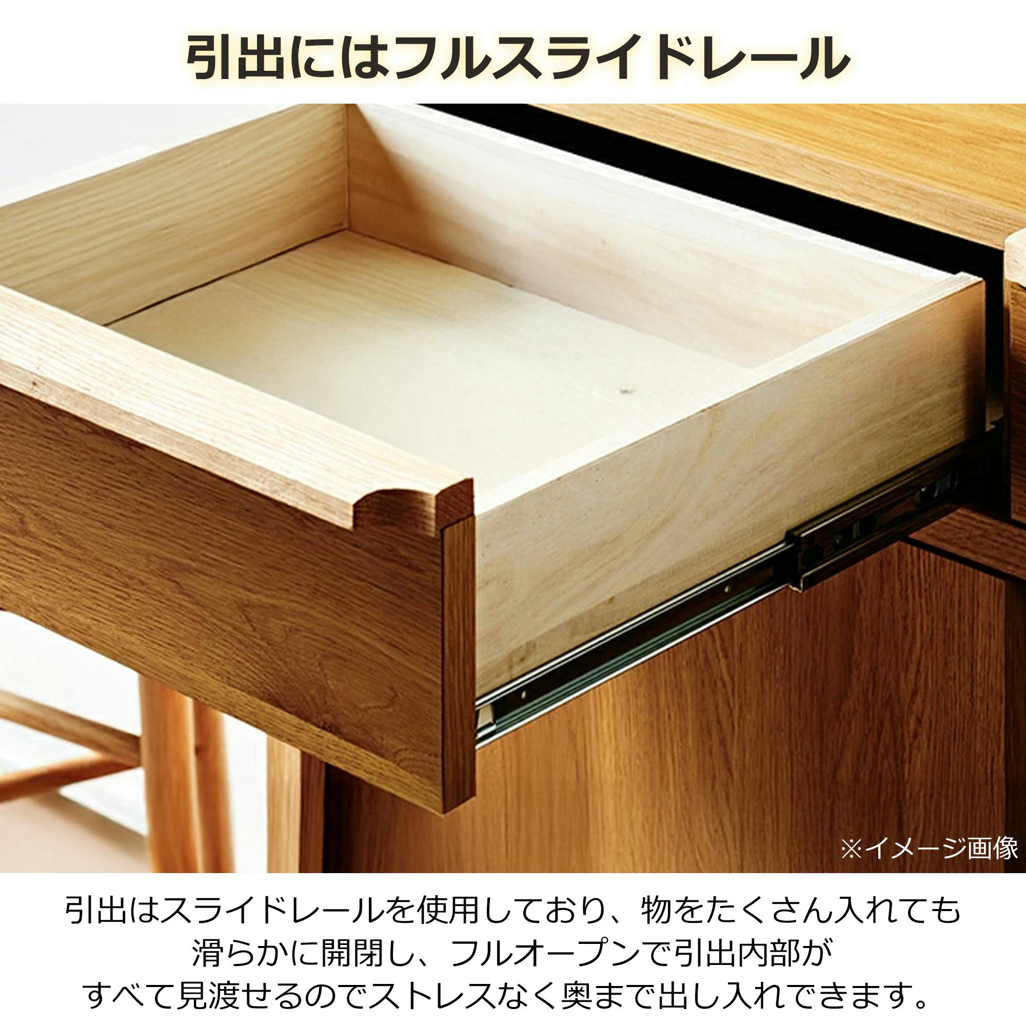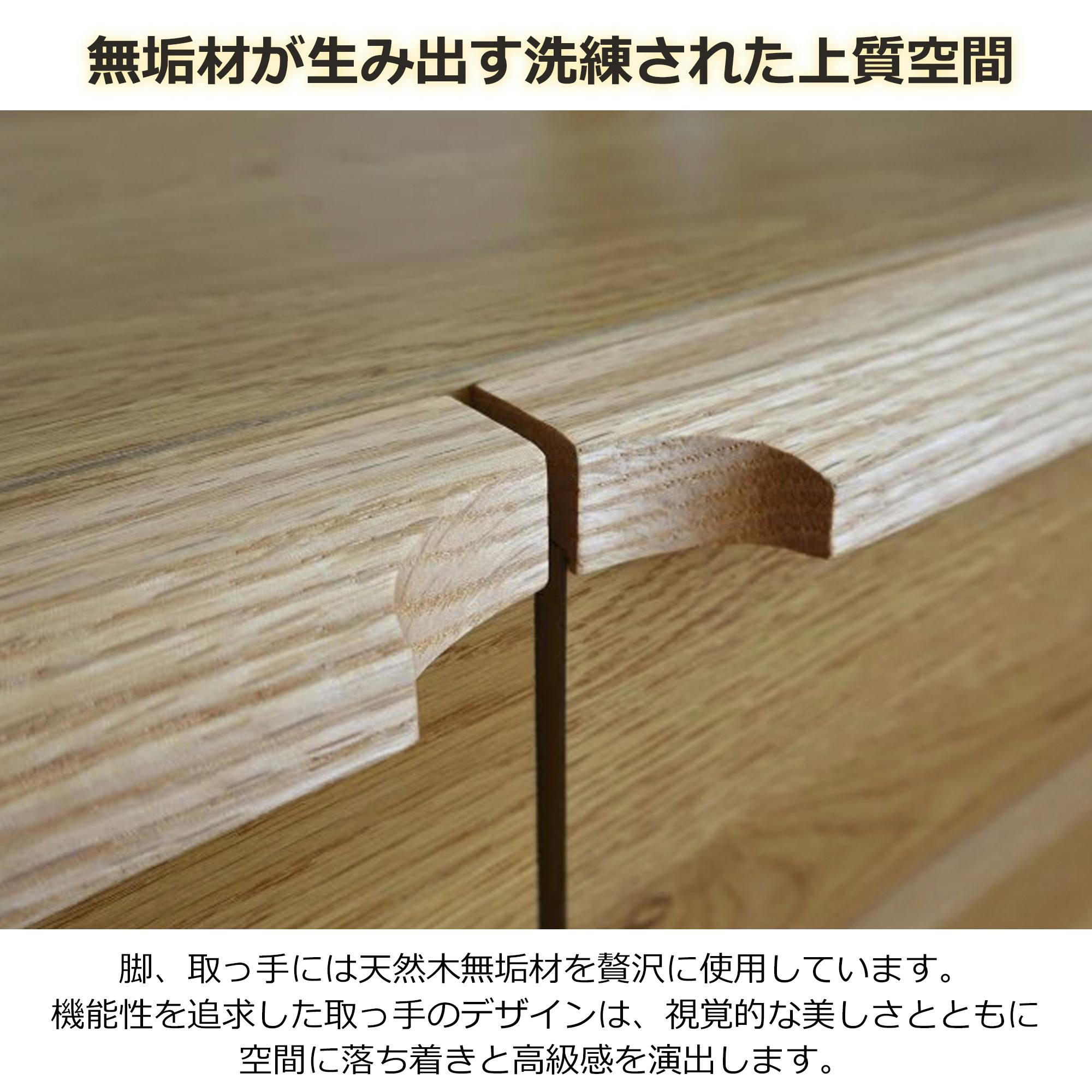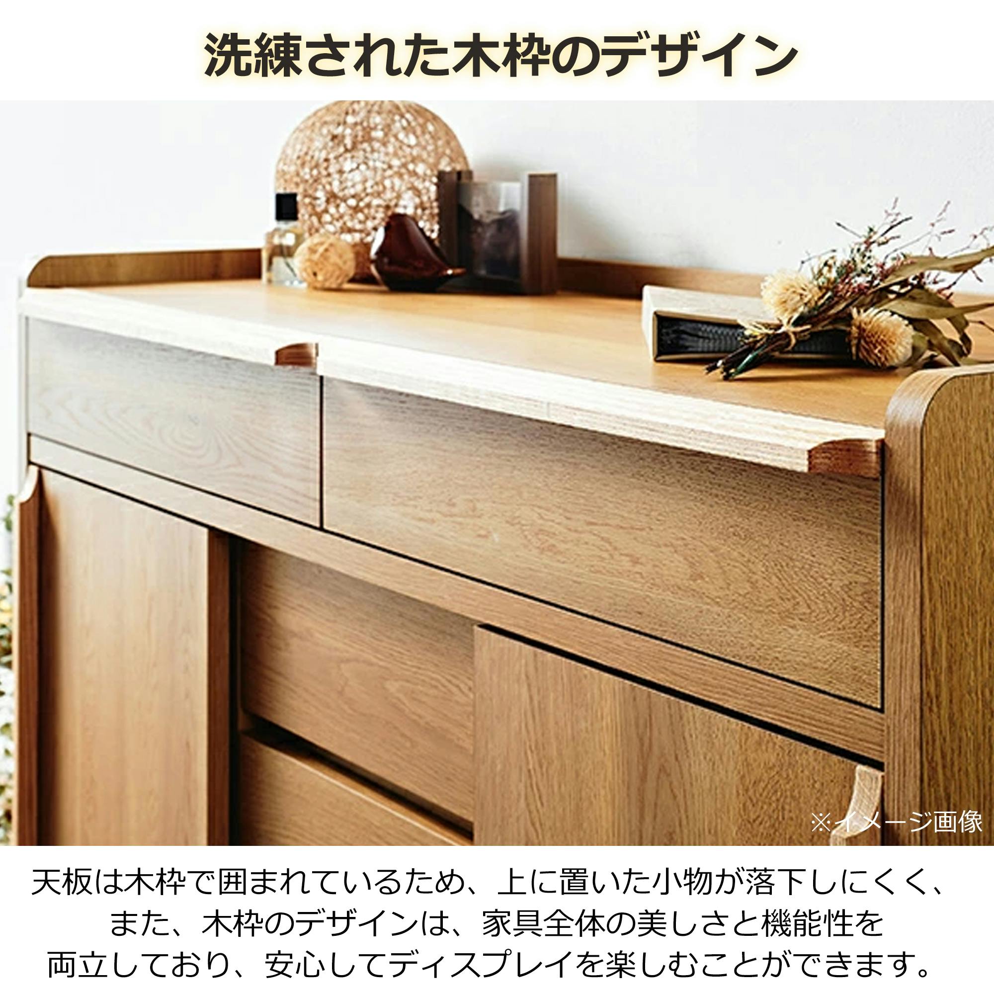 天板の周囲に囲いがあるため、置物が落ちにくい作りとなっております。取手は形にこだわり、また無垢材を採用しております。