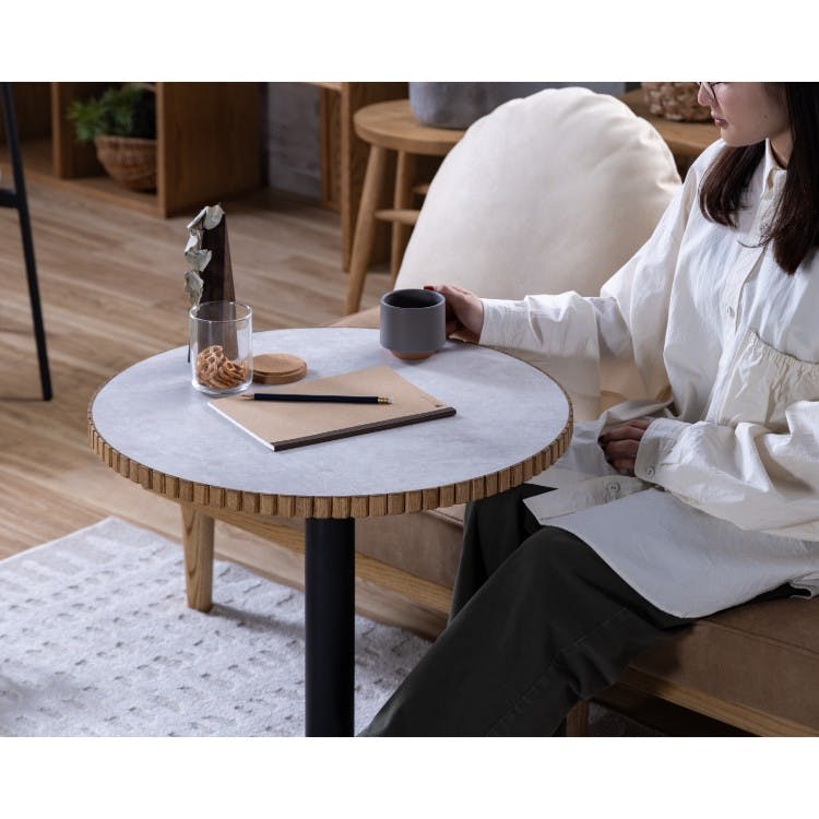 タルト生地のような面材が可愛らしい特徴的なカフェテーブルです。天板はメラミン生地の為、水や汚れに強いです。