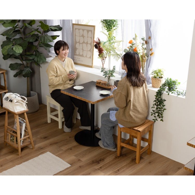 タルト生地のような面材が可愛らしい特徴的なカフェテーブルです。天板はメラミン生地の為、水や汚れに強いです。