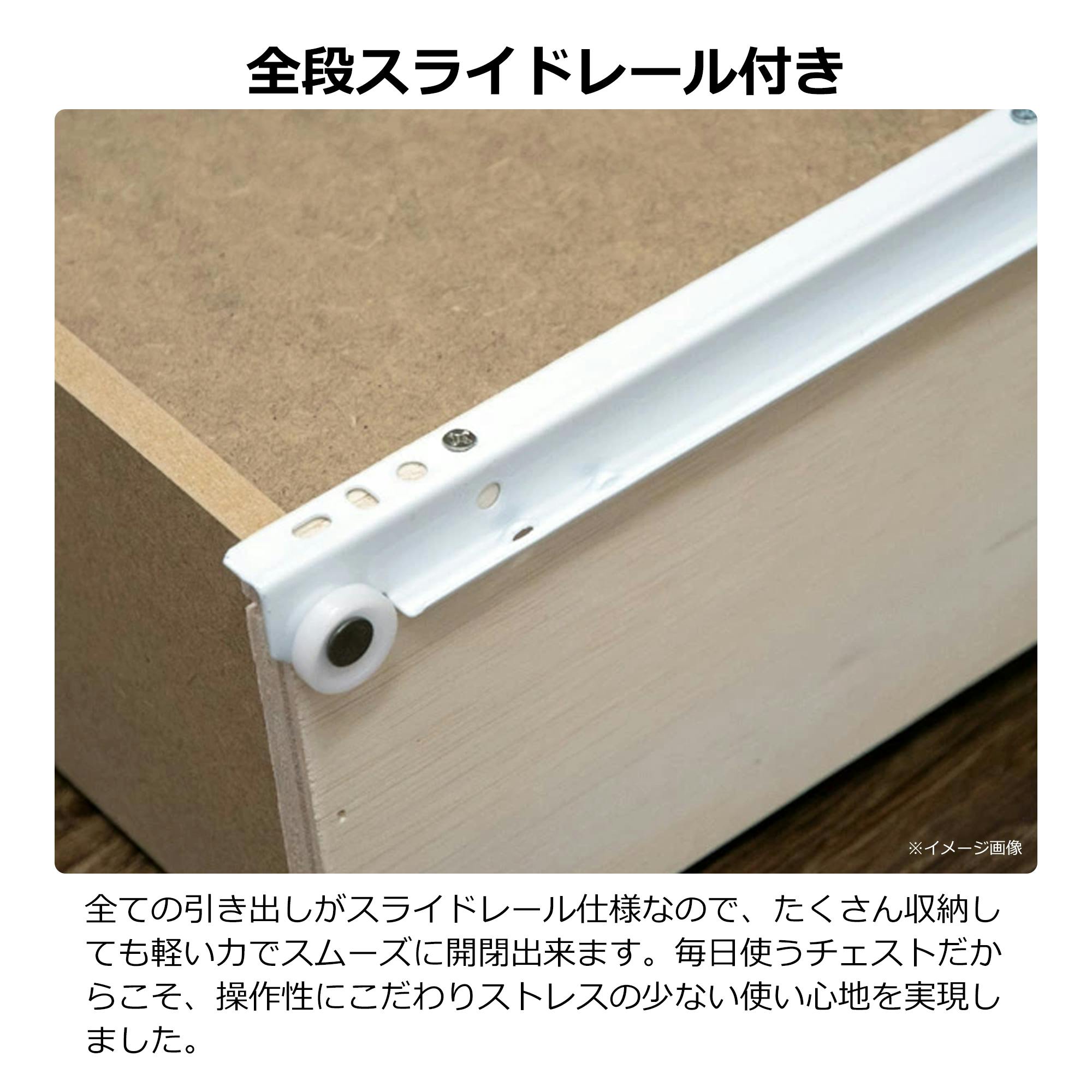 前板裏の溝に指をかけて開閉します。引き出しは全段スライドレールを採用。スライドレールはストッパー付き。