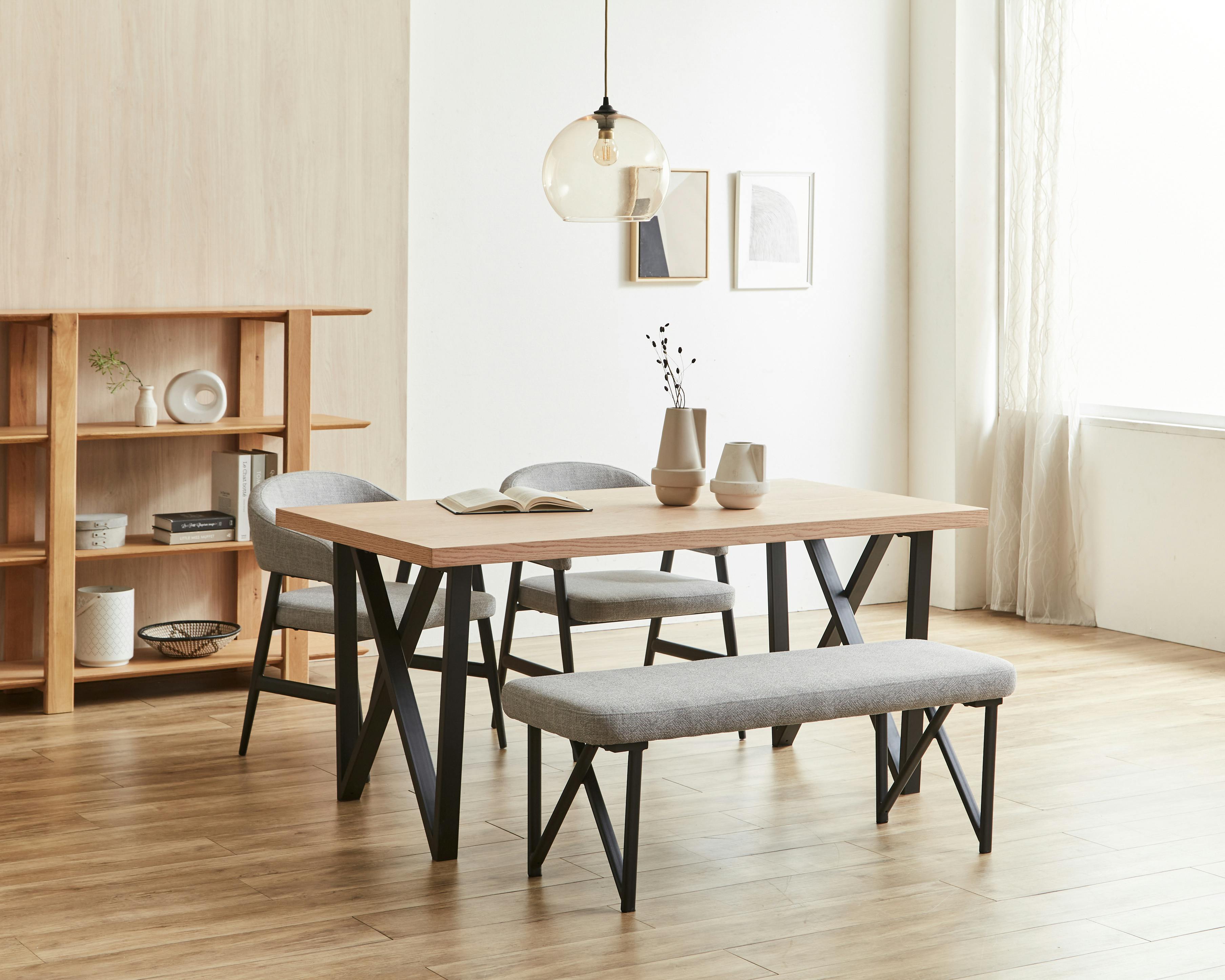 クロスアイアン脚が、重厚でスタイリッシュなダイニングを演出。ファブリック、スチールの異素材ミックスと豊富なカラーで、自分らしい空間づくりが楽しめます。