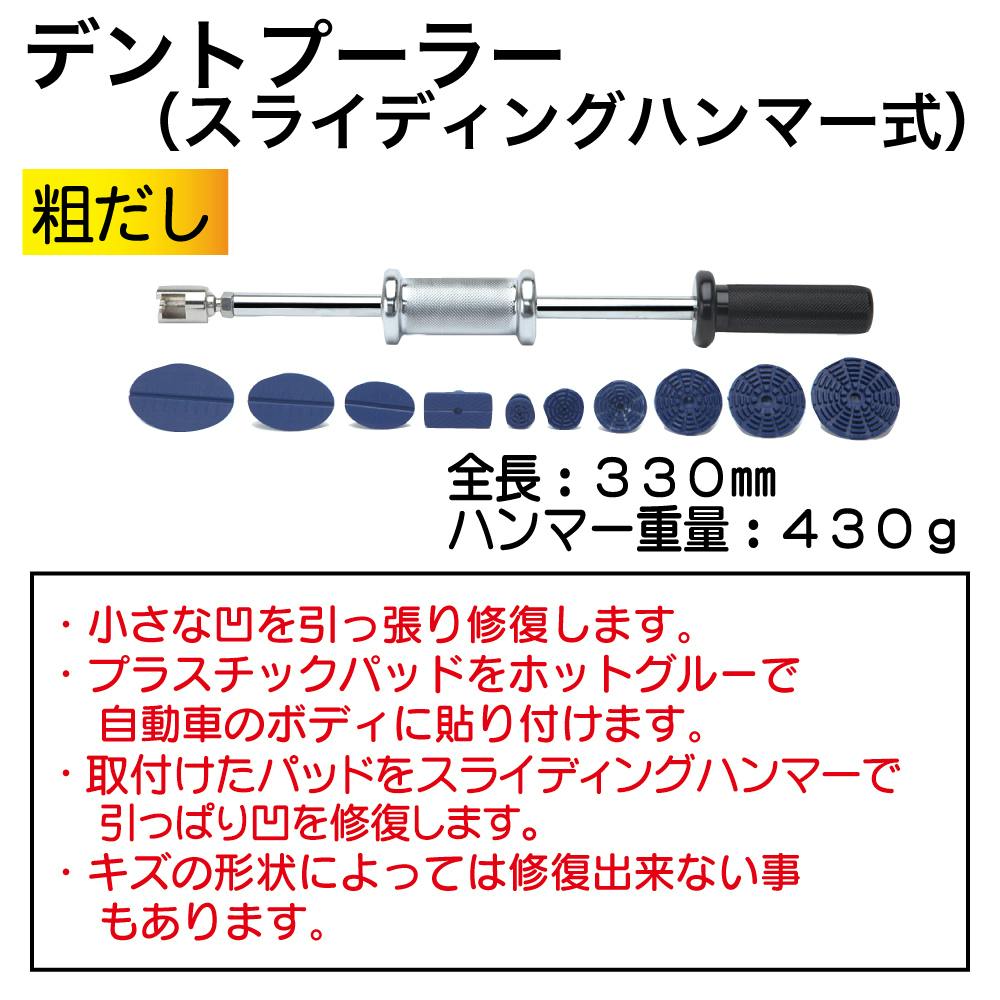 ・プラスチックパッドをホットグルー(グルーガン)で自動車のボディに貼り付けます。・取付けたパッドをスライディングハンマーで引っぱり凹を修復します。※キズの形状によっては修復出来ない事もあります。【セット内容】デントプーラー本体×1、プラスチックパッド×10種類