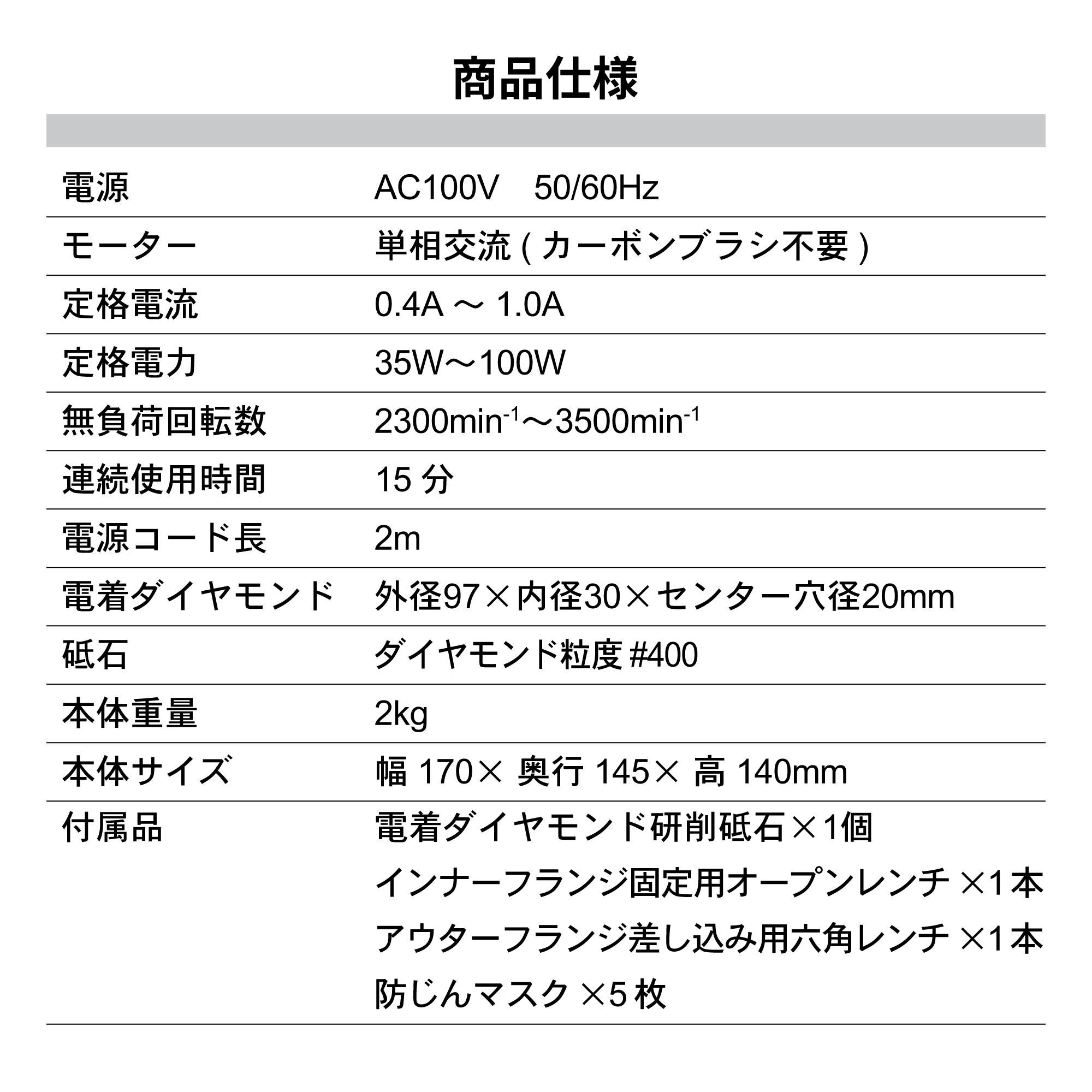 電源:AC100V 50/60Hzモーター:単相交流(カーボンブラシ不要)定格電流:0.4A~1.0A定格電力:35W~100W無負荷回転数:2300min-1~3500min-1連続使用時間:15分電源コード長:2m電着ダイヤモンド:外径97×内径30×センター穴径20mm砥石:ダイヤモンド粒度#400