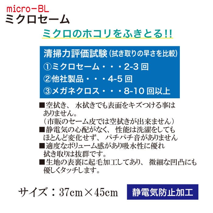 ■適度なボリューム感があり吸水性に優れ拭き取りは抜群です。■生地の表裏に起毛加工してあり、微細な凹凸にも優しくタッチします。清掃力評価試験(拭き取りの早さを比較)(1)ミクロセーム・・・2-3回(2)他社製品・・・4-5回(3)メガネクロス・・・8-10回以上