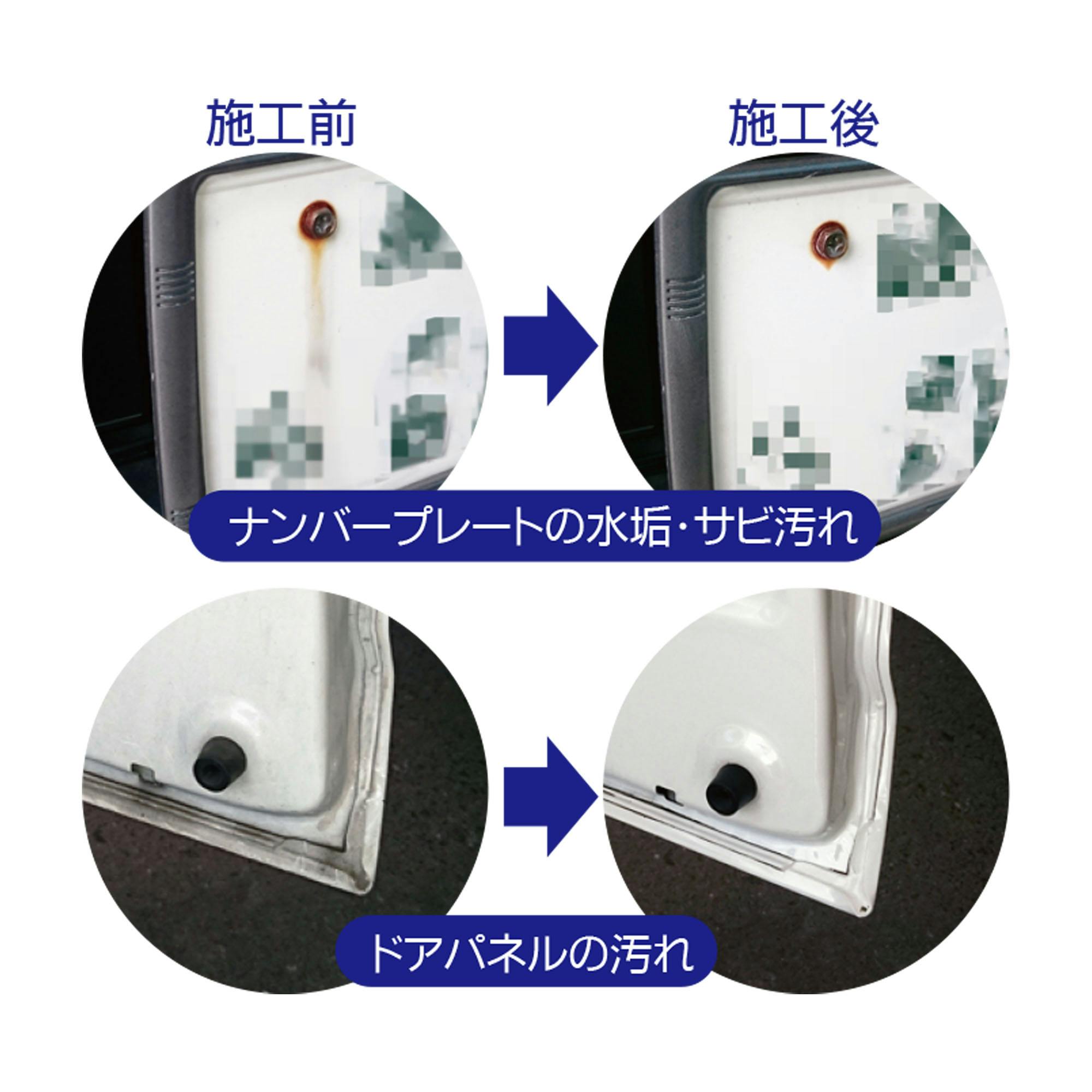 塗布スポンジ・マイクロファイバー等に適量つけて汚れを除去し、拭き上げるだけです。また、こびり付いたコンパウンド・ワックスの固まりを除去するのにも使用出来ます。※除去後、塗膜表面にシリコーンの保護皮膜が形成されます。コンパウンド・研磨材使用内容量:100ml
